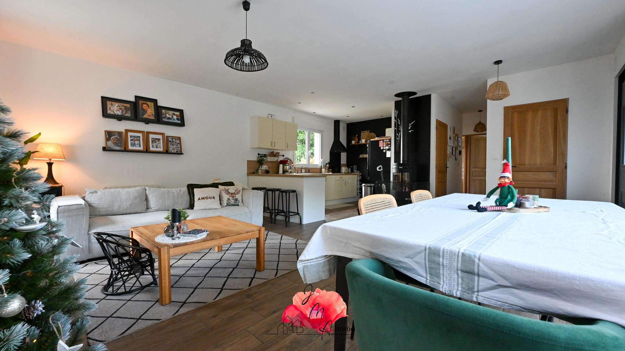 Dès l'entrée, vous découvrirez une vaste et lumineuse pièce de vie, véritable coeur de la maison, sublimée par un poêle à bois apportant chaleur et convivialité.