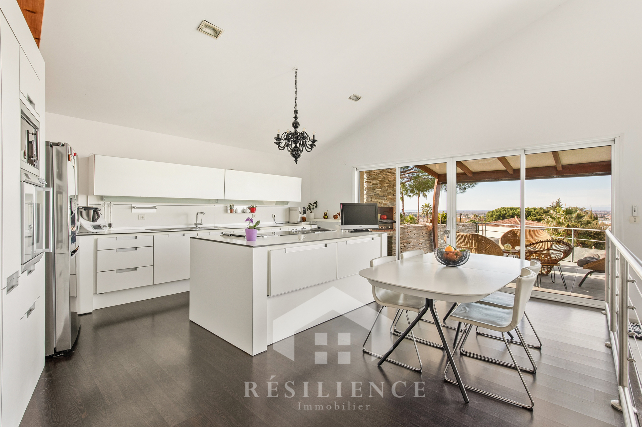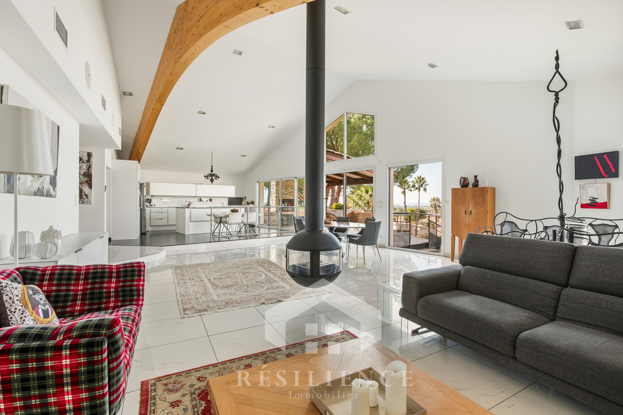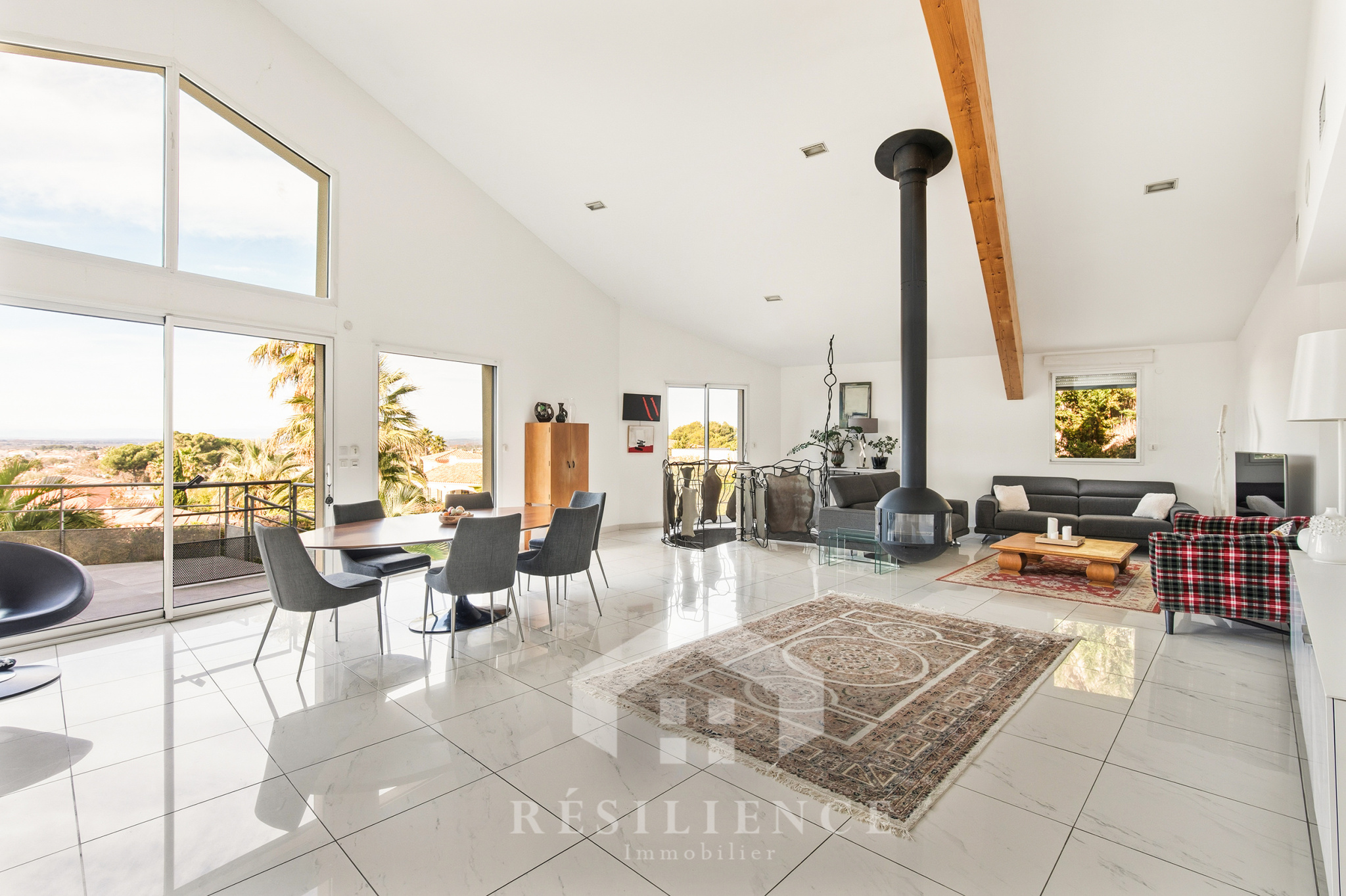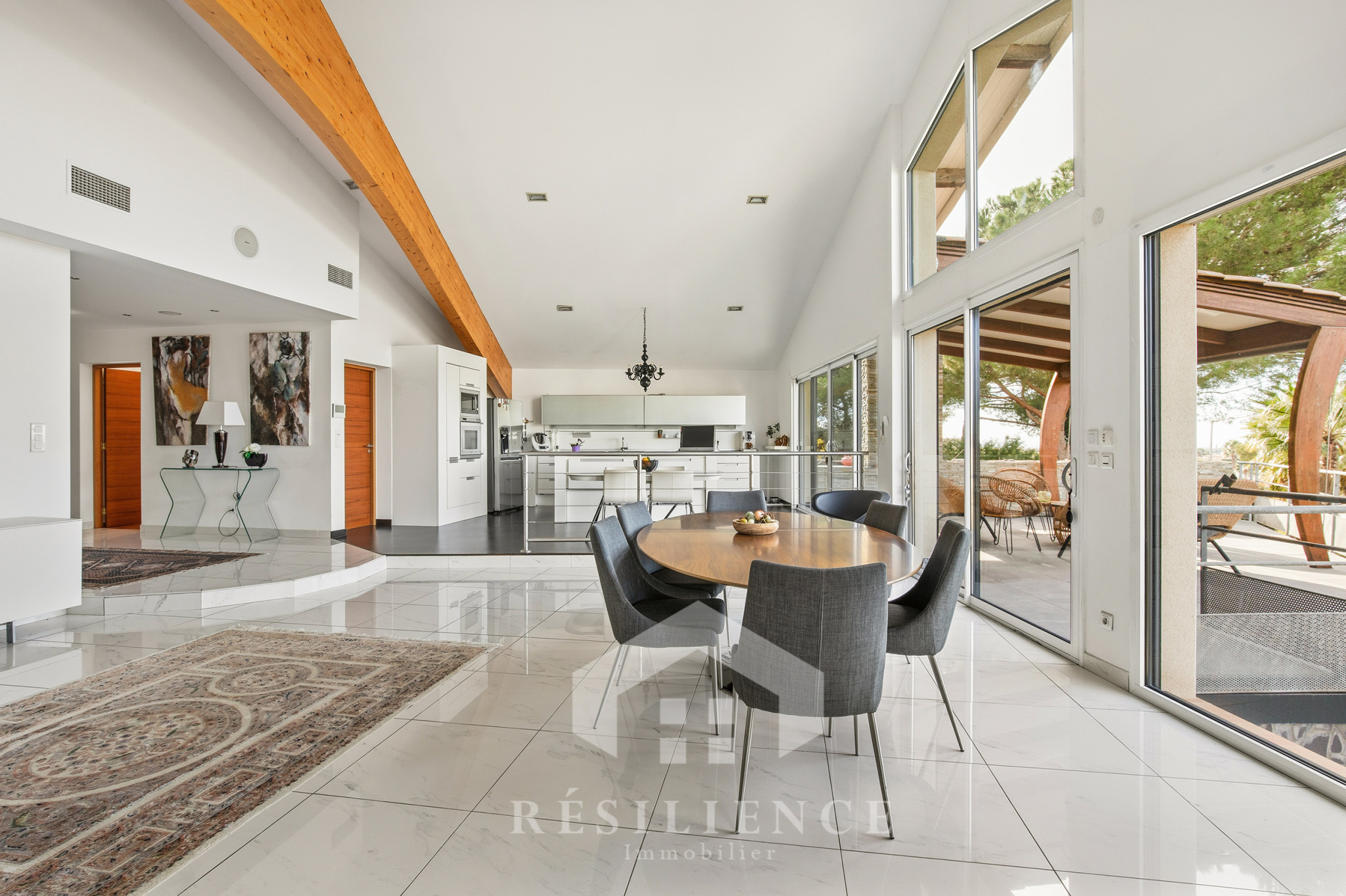 Dans un environnement confidentiel et préservé, en lisière d'une vaste zone naturelle arborée et à seulement dix minutes des plages, Résilience Immobilier a le privilège de présenter cette maison d'architecte d'exception, véritable oeuvre contemporaine dominant la ville d'Agde, la Méditerranée et, à l'horizon, la chaîne des Pyrénées. Implantée sur une parcelle de 1 300 m2 de jardin paysagé et arboré aux essences méditerranéennes : oliviers, oranger, palmiers, entièrement close de murs, avec piscine 10x5m, la maison de 312 m2 habitables se distingue par la qualité de son architecture, la générosité de ses volumes et la cohérence de ses espaces de vie. Dès l'entrée, la maison impose sa signature : une entrée cathédrale de 6,5 mètres de hauteur sous plafond, un double escalier monumental, et un lustre suspendu pensé comme une oeuvre d'art, composent une scénographie intérieure saisissante, baignée de lumière. Le séjour de réception de 80 m2, aux volumes cathédrale avec ses 5,5m d'hauteur sous plafond, est sublimé par un poêle suspendu, créant une atmosphère à la fois élégante, chaleureuse et d'une lumière omniprésente. La cuisine ouverte de 25 m2, aux lignes contemporaines, se prolonge naturellement vers une terrasse de 27 m2, offrant une vue imprenable sur la ville, la mer et les coucher de soleils. Un véritable tableau vivant. Outre les espaces de vies, le rez-de-chaussée accueille également 3 chambres pensées comme des suites privées : * Une suite complète avec salle de bains, douche et WC * Deux chambres, avec une salle d'eau avec WC * WC invités * Buanderie / arrière-cuisine de 11 m2 À l'étage, la Master bedroom de 32 m2 offre un espace intime et exclusif, avec dressing sur mesure et salle d'eau avec WC, très lumineuse. Le rez-de-jardin, avec accès direct sur les extérieurs et piscine se compose : * D'un salon d'été, idéal pour les réceptions * 5ème chambre avec salle de bains et WC * Piscine 10 x 5 m, parfaitement intégrée au jardin paysager Quelques dépendances: * Garage de 40 m2 * Garage à vélos de 16 m2 * Local technique piscine Prestations haut de gamme, volumes maîtrisés, circulation fluide, prestations de qualité et panorama unique font de cette villa un bien singulier, destiné à des acquéreurs en recherche de calme, d'espace et de caractère, entre nature, architecture et horizon marin. Un bien rare sur le marché Agathois, réservé aux amateurs de lieux d'exception. Intéressés? Contactez-nous.
