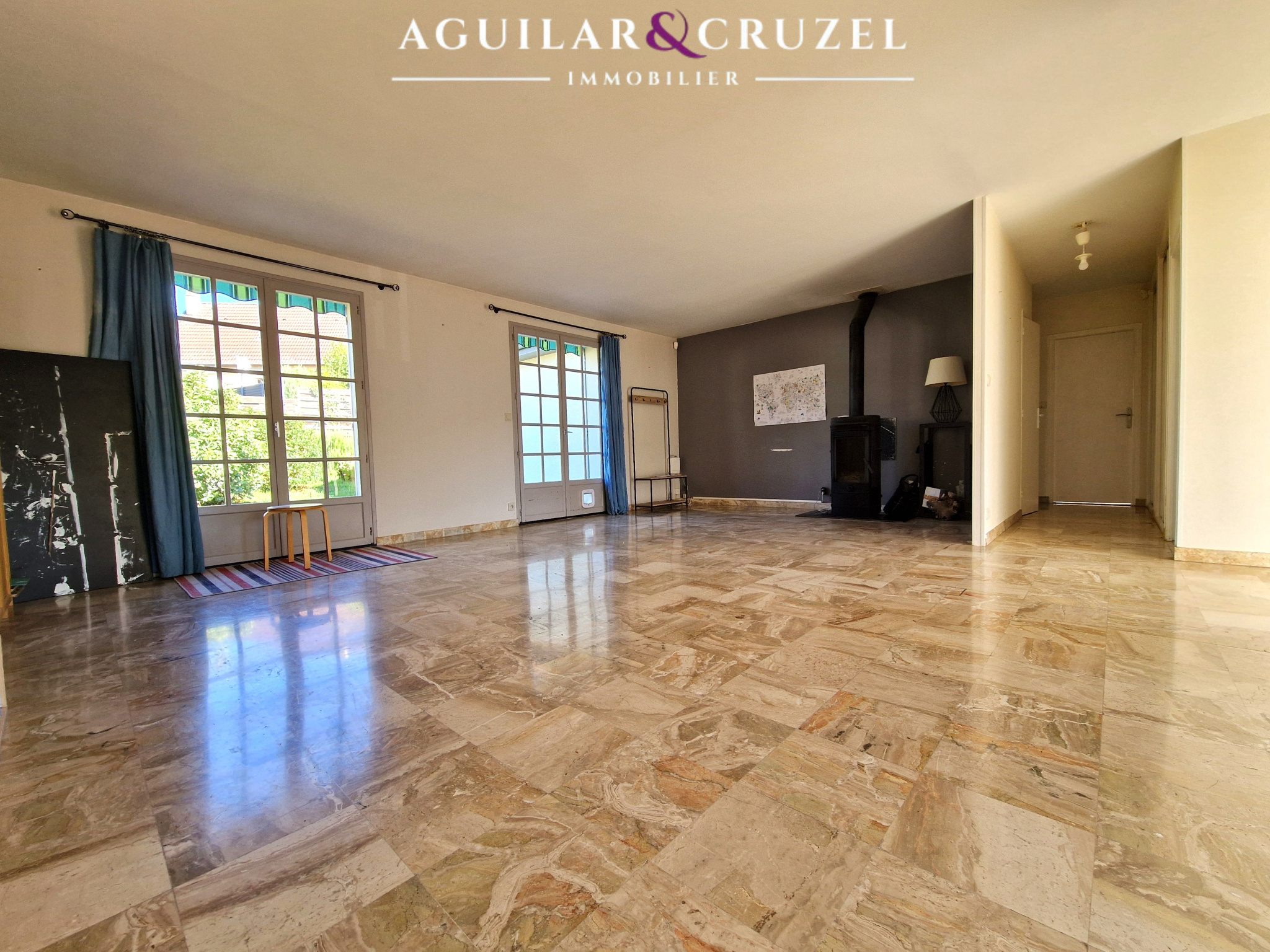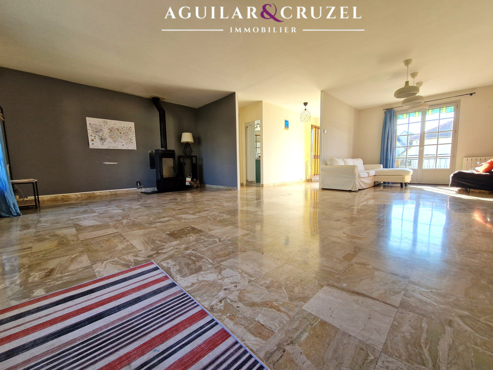 Un bel espace salon-séjour lumineux avec cheminée,