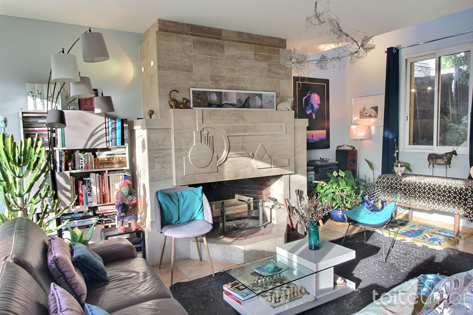 Elle comprend au rez-de-chaussée un séjour ouvert sur le jardin avec une grande cheminée, une cuisine équipée, un salon télé et une buanderie/cellier.