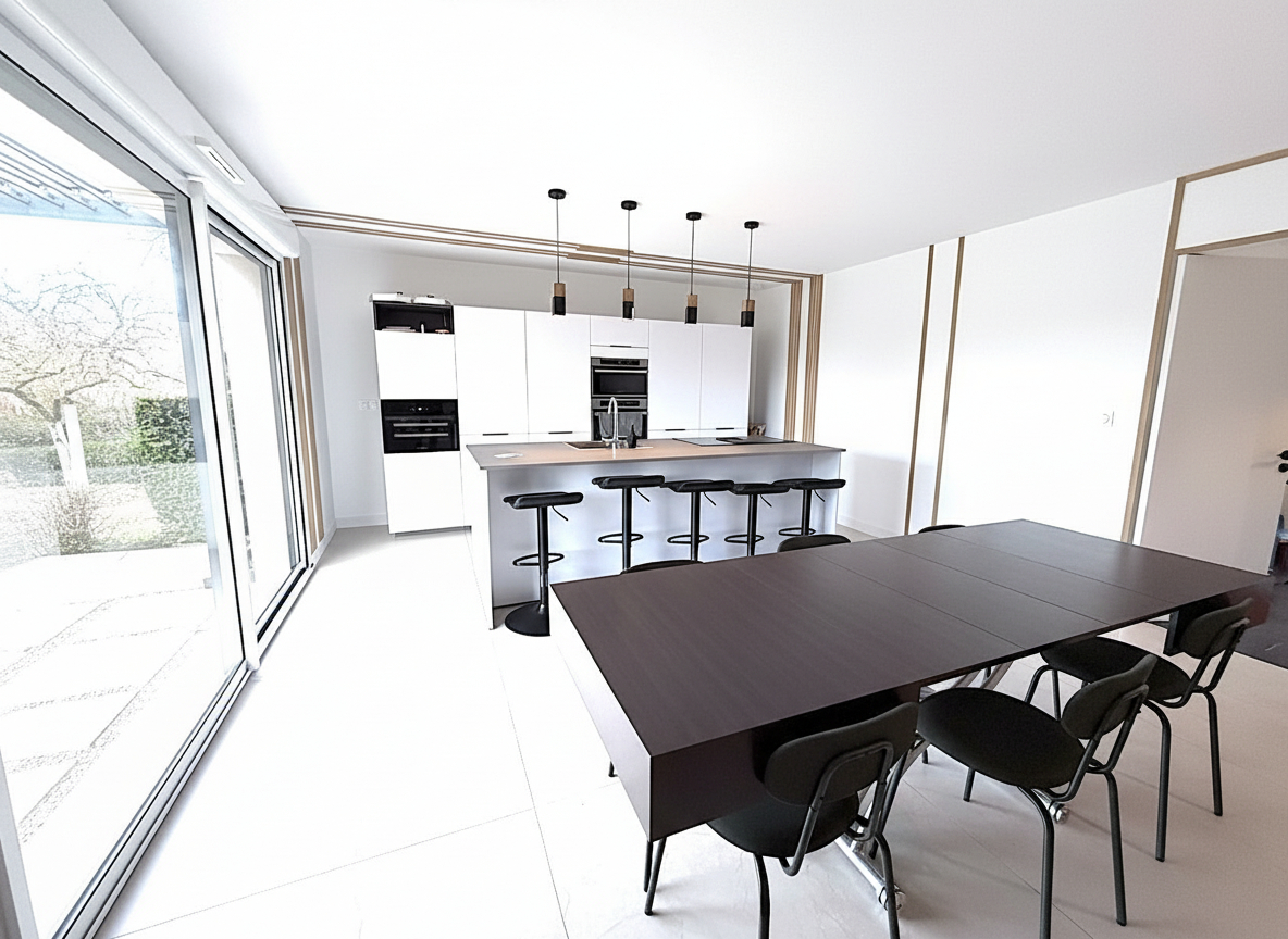 À l'intérieur, confort et élégance sont au rendez-vous. Dès l'entrée, un magnifique poêle à granulés étanche attire le regard et diffuse une chaleur douce et économique. Vous accédez directement à une vaste pièce de vie de 49 m², baignée de lumière, qui réunit un salon accueillant, un espace repas convivial et une cuisine moderne entièrement équipée, avec cave à vin intégrée. Une large porte-fenêtre prolonge naturellement cet espace vers la terrasse et la piscine en contrebas.