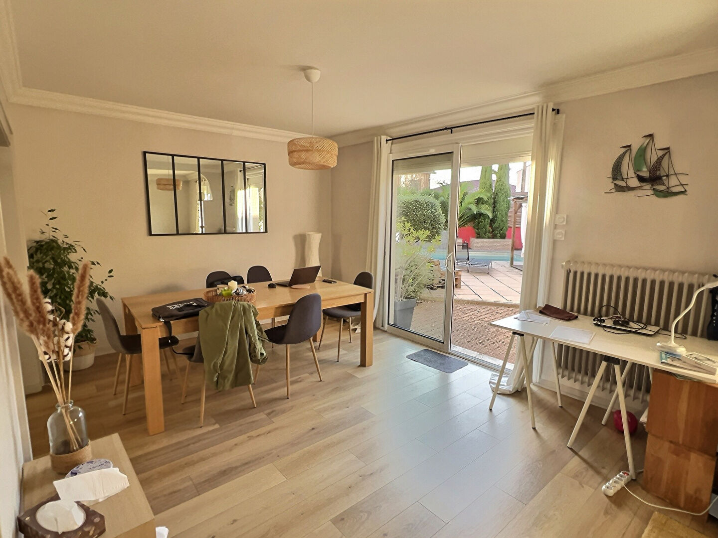 Au rez de chaussée, une entrée de 10m² dessert une cuisine équipée et aménagée donnant sur un séjour lumineux avec accès à la terrasse et à la piscine ombragée, à l'abri des regards .