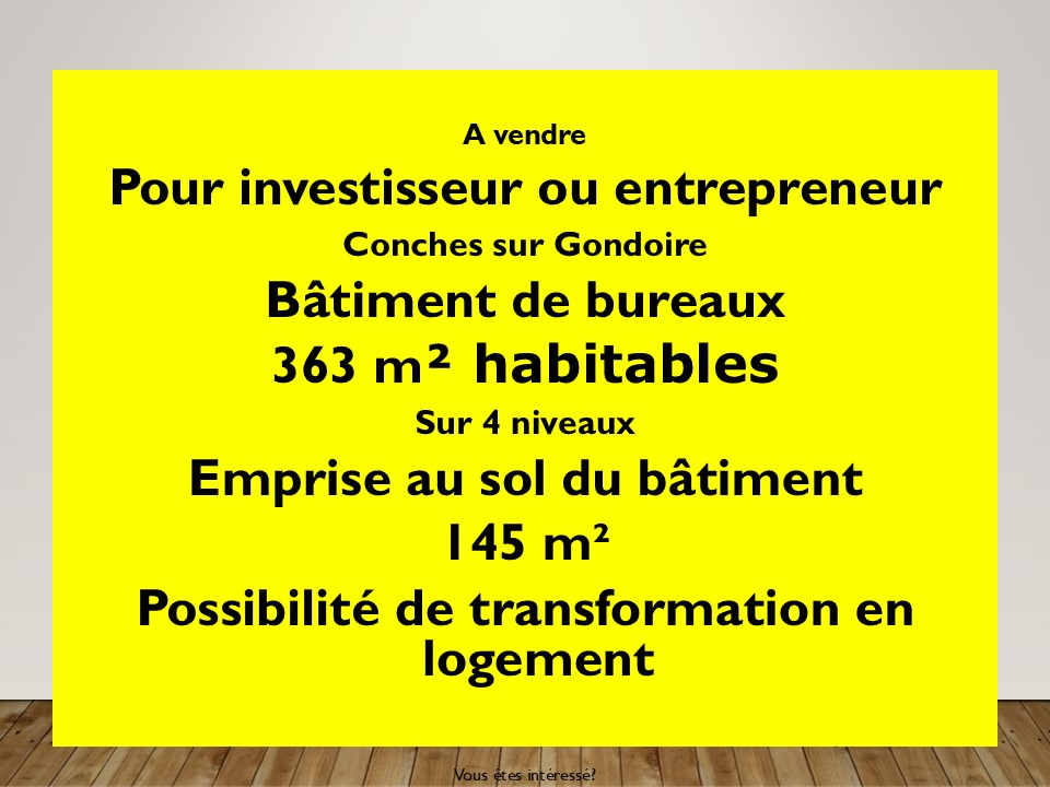 Conches sur Gondoire 77600 - Immeuble de bureau de 363 m² habitables sur 4 niveaux, 14 pièces dont un appartement de 85 m². L'immeuble peut être transformé en logement. Distribution de l'immeuble favorable.