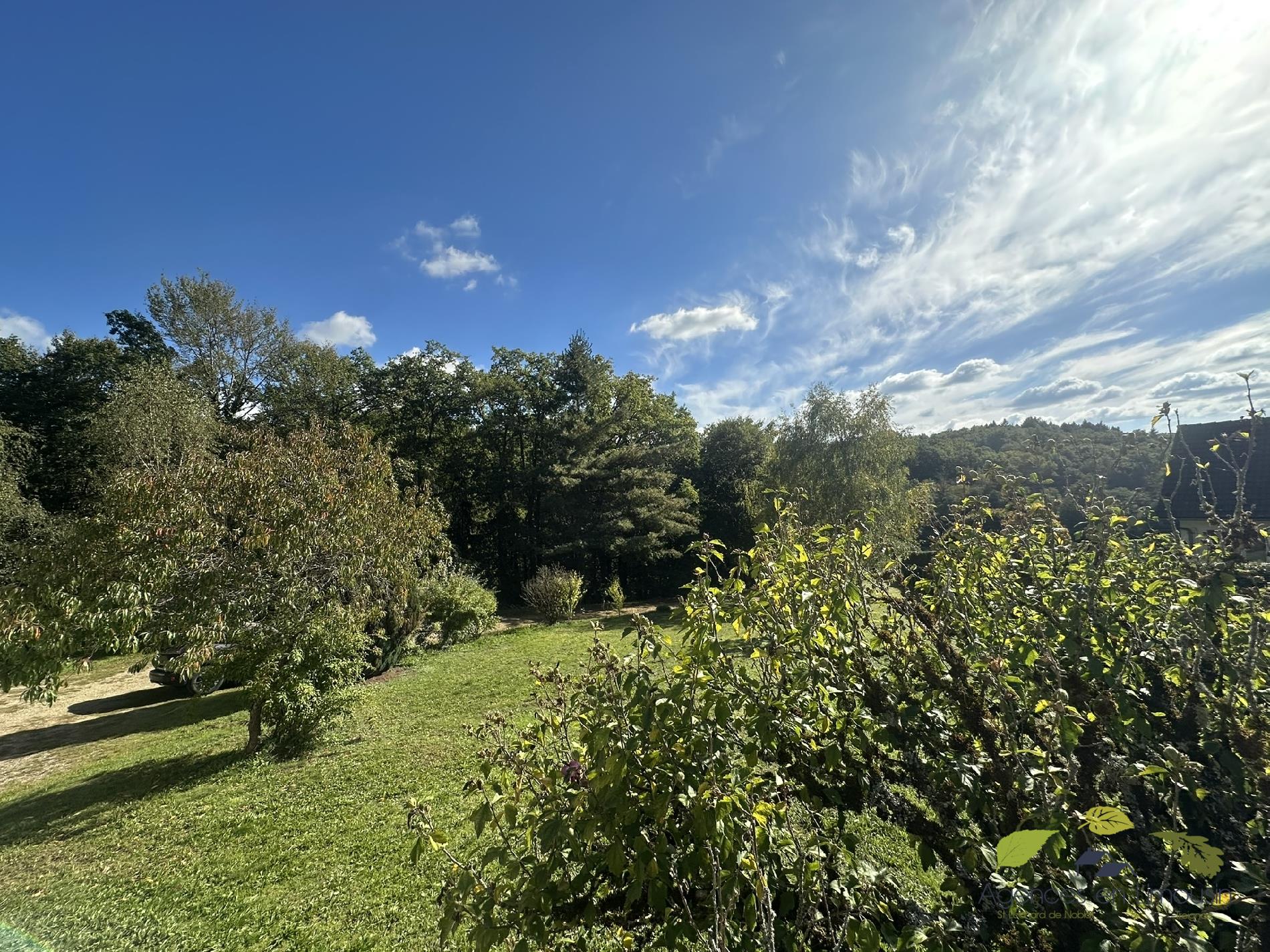 grande terrasse bien exposée, terrain arboré de 3300 m² avec vue dégagée sur la campagne, dépendance.