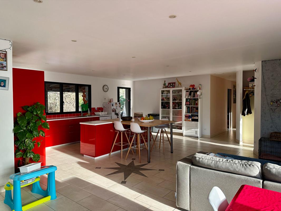 L'intérieur est composé d'une entrée, d'une grande cuisine ouverte sur le salon, de trois chambres, d'une salle de bain/douche, d'une chambre parentale avec sa salle de douche, d'un WC et d'un cellier.