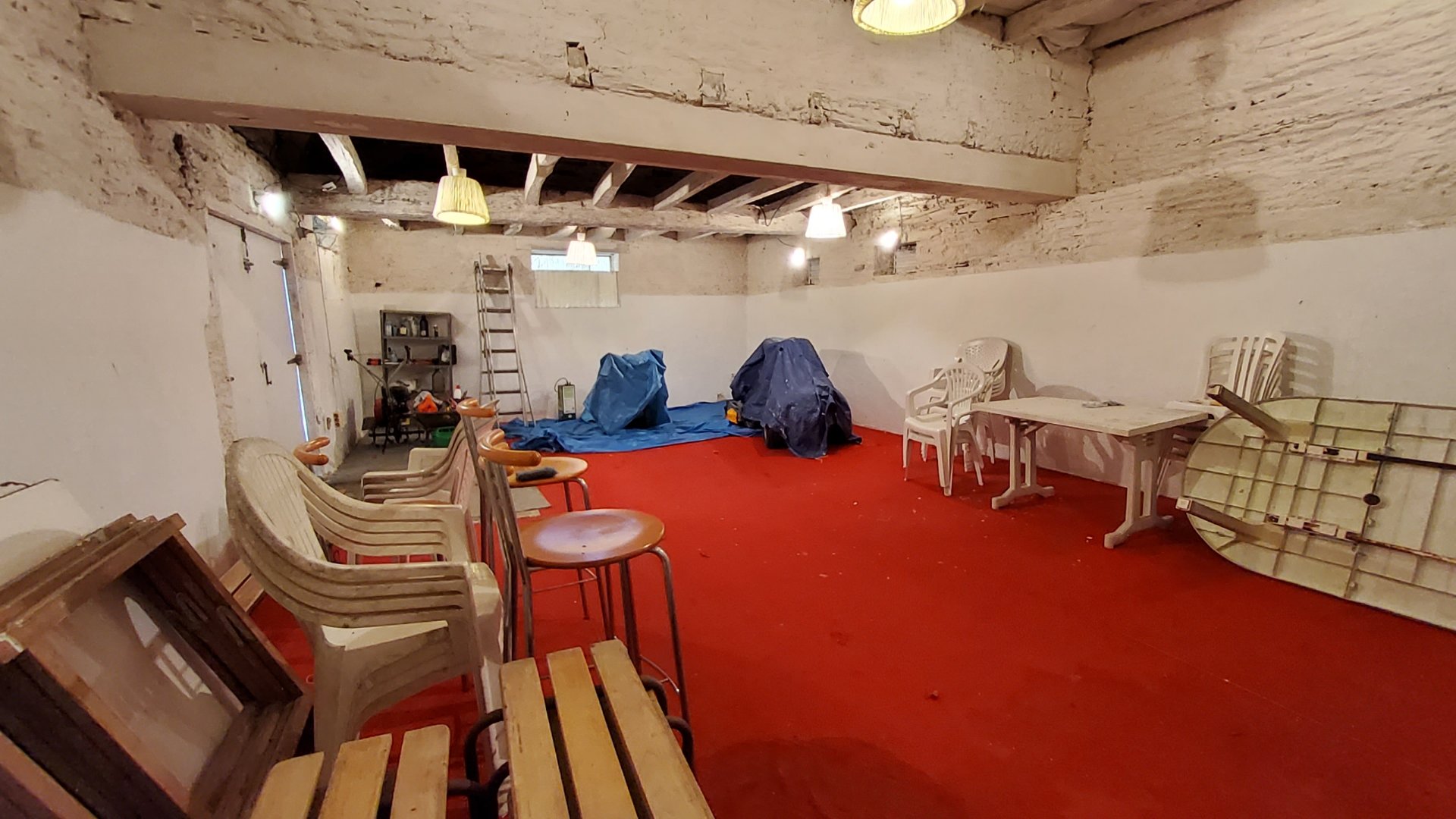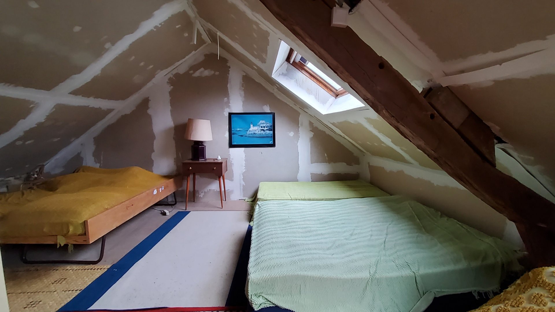 La deuxième partie (en partie aménagée) se compose d'une pièce de vie, d'une grande chambre sous rampant, d'un débarras, des toilettes indépendantes et d'un grand garage de 50m².