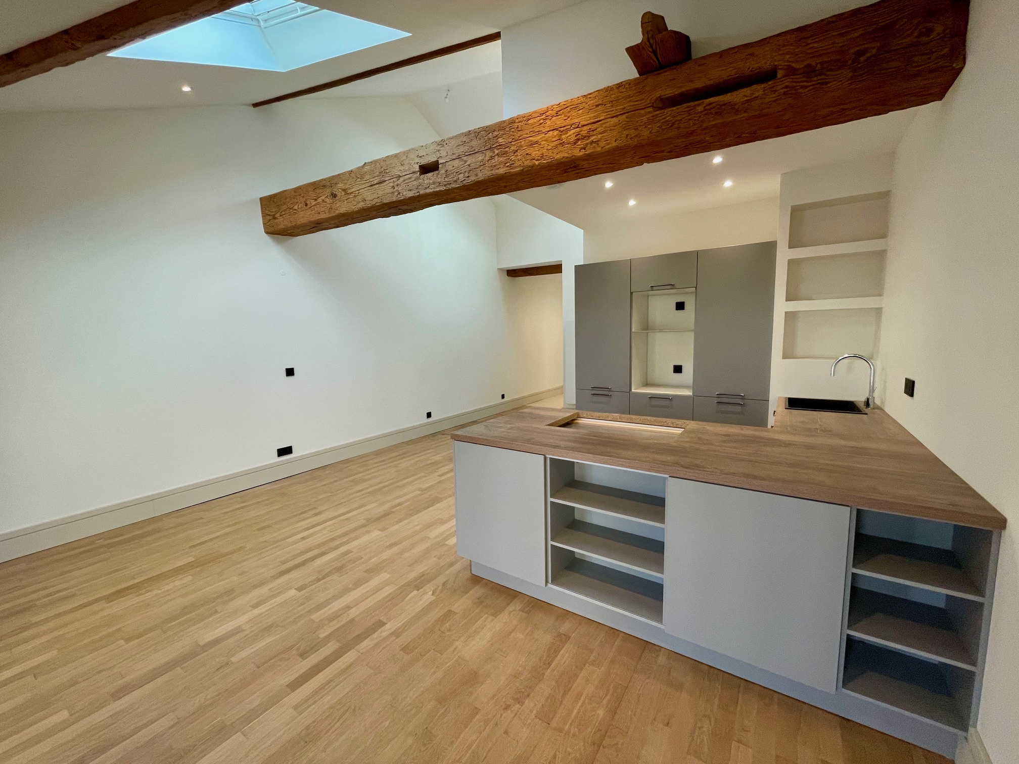 Composé : entrée dégagement, cuisine aménagée avec îlot central (provenance : 'Différence cuisine') ouverte sur séjour avec poutres apparentes, une chambre avec salle de douche. WC séparé.