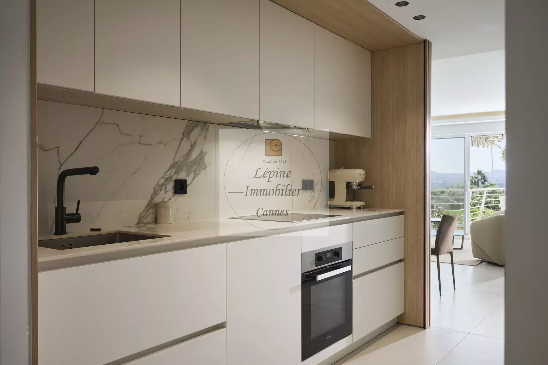 Un séjour spacieux ouvrant sur une terrasse de 13 m² environ, offrant une magnifique vue panoramique sur la mer et la Croisette. Une cuisine moderne complète cet espace.