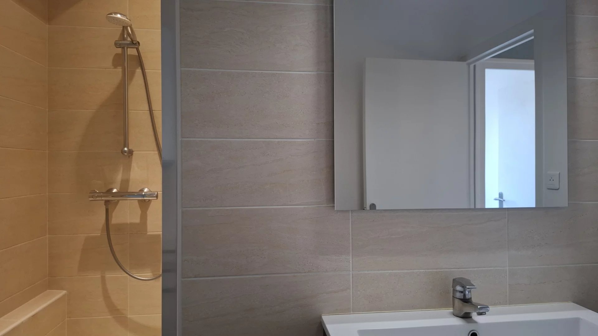 L'appartement bénéficie d'une double exposition, sans vis-à-vis, avec une vue panoramique depuis son extérieur. L'entrée commande un salon, le couloir vous guide des pièces d'eaux (WC et salle de douche séparés) vers la cuisine/salle à manger, en passant par la chambre.