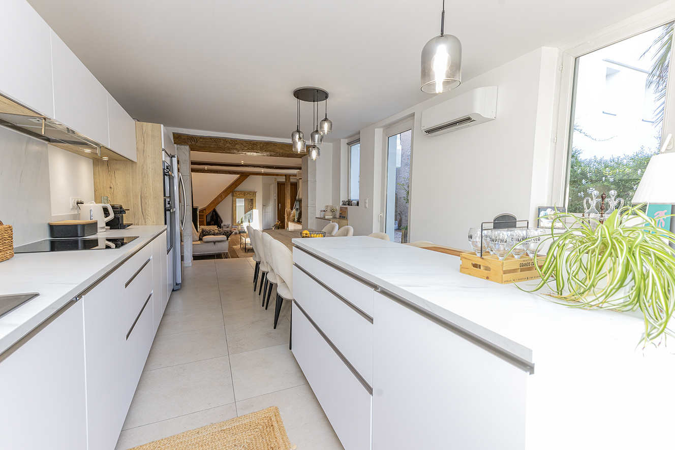 La cuisine, ouverte et lumineuse, s'étire vers l'extérieur.