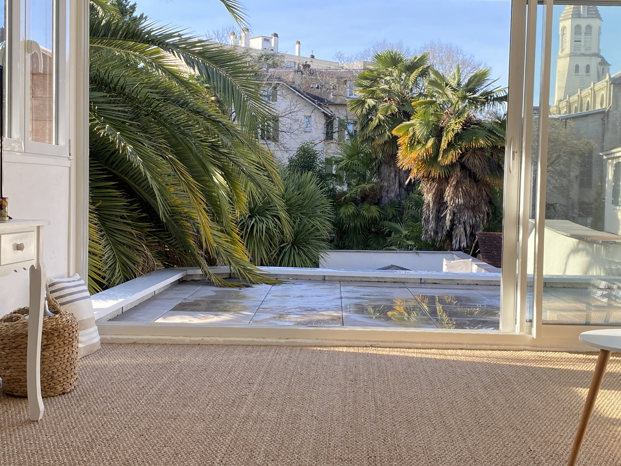 ouverte sur une terrasse surélevée qui surplombe la piscine, en silence.