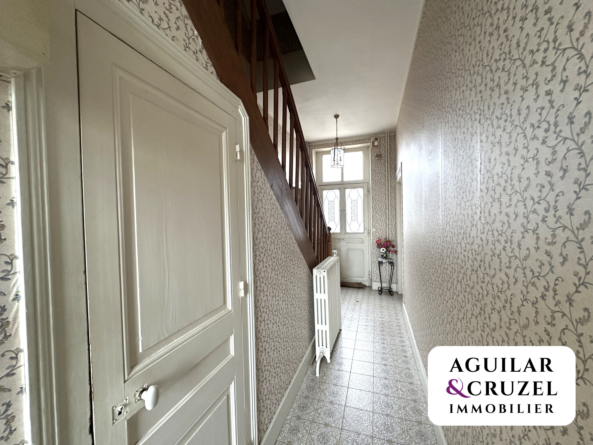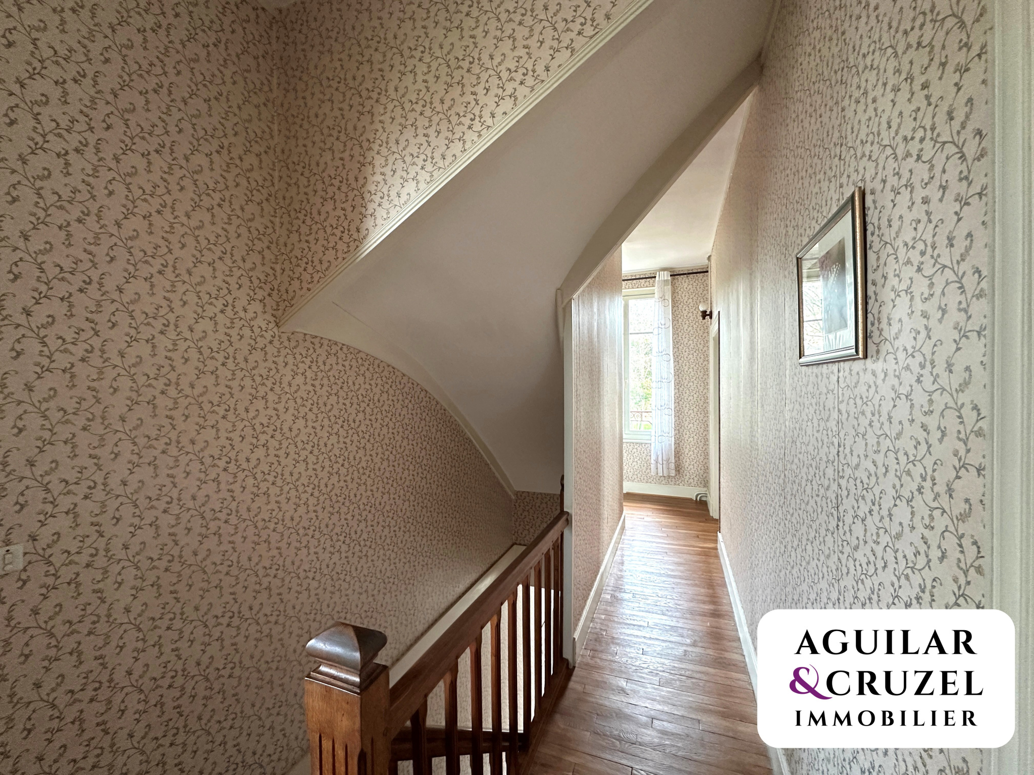 Un bel escalier en bois mène au premier étage, où vous trouverez un vaste palier desservant trois chambres, dont une avec point d'eau, ainsi qu'une salle d'eau moderne avec WC.