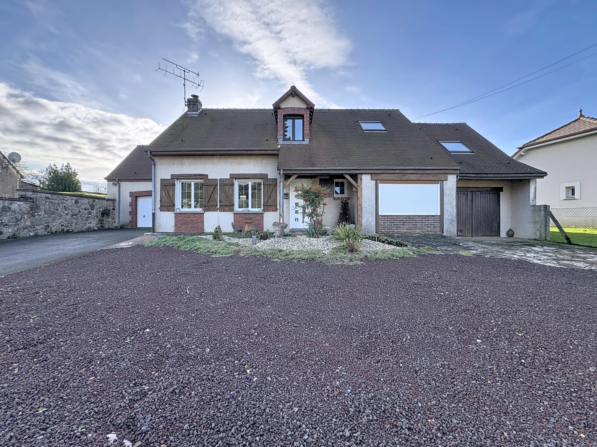 Maison d'habitation comprenant hall d'entrée, salon séjour en L avec poêle à bois, cuisine équipée ouverte sur séjour, bureau ou chambre, salle d'eau avec toilettes, buanderie, véranda chauffée, à l'étage : palier desservant deux chambres, une pièce à usage de chambre, salle de jeux, salle de bains avec toilettes, en annexe : deux garages (un avec cave et accès au vide-sanitaire, l'autre avec grenier), une dépendance, bassin, terrain arboré.