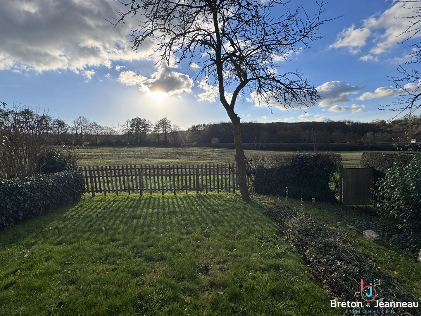 Environnement agréable avec vue sur les champs, un beau jardin arboré à l'arrière du terrain.