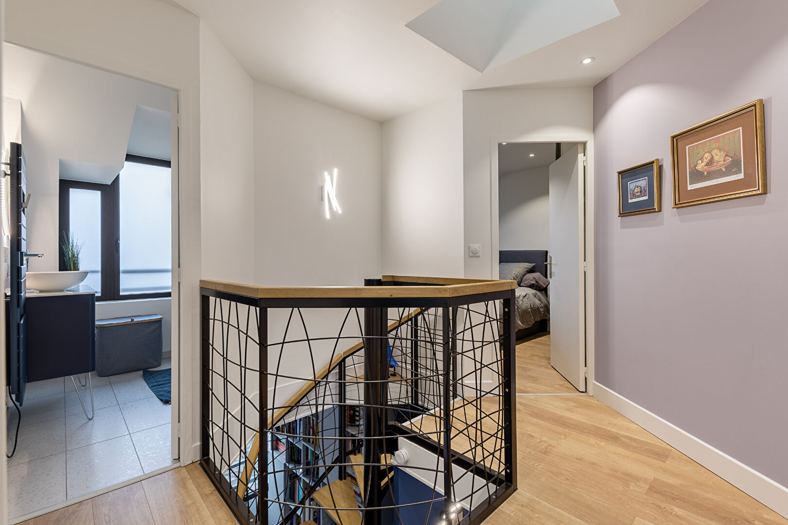 un séjour salon très agréable, une cuisine indépendante, une lingerie, plusieurs rangements, un splendide escalier fait par un ferronnier d'art qui vous conduit à l'étage où vous bénéficierez de 2 chambres avec espace bureau et placards, une 3ème chambre avec dressing ,une salle de bain et une salle de douche, toutes deux modernes et raffinées.