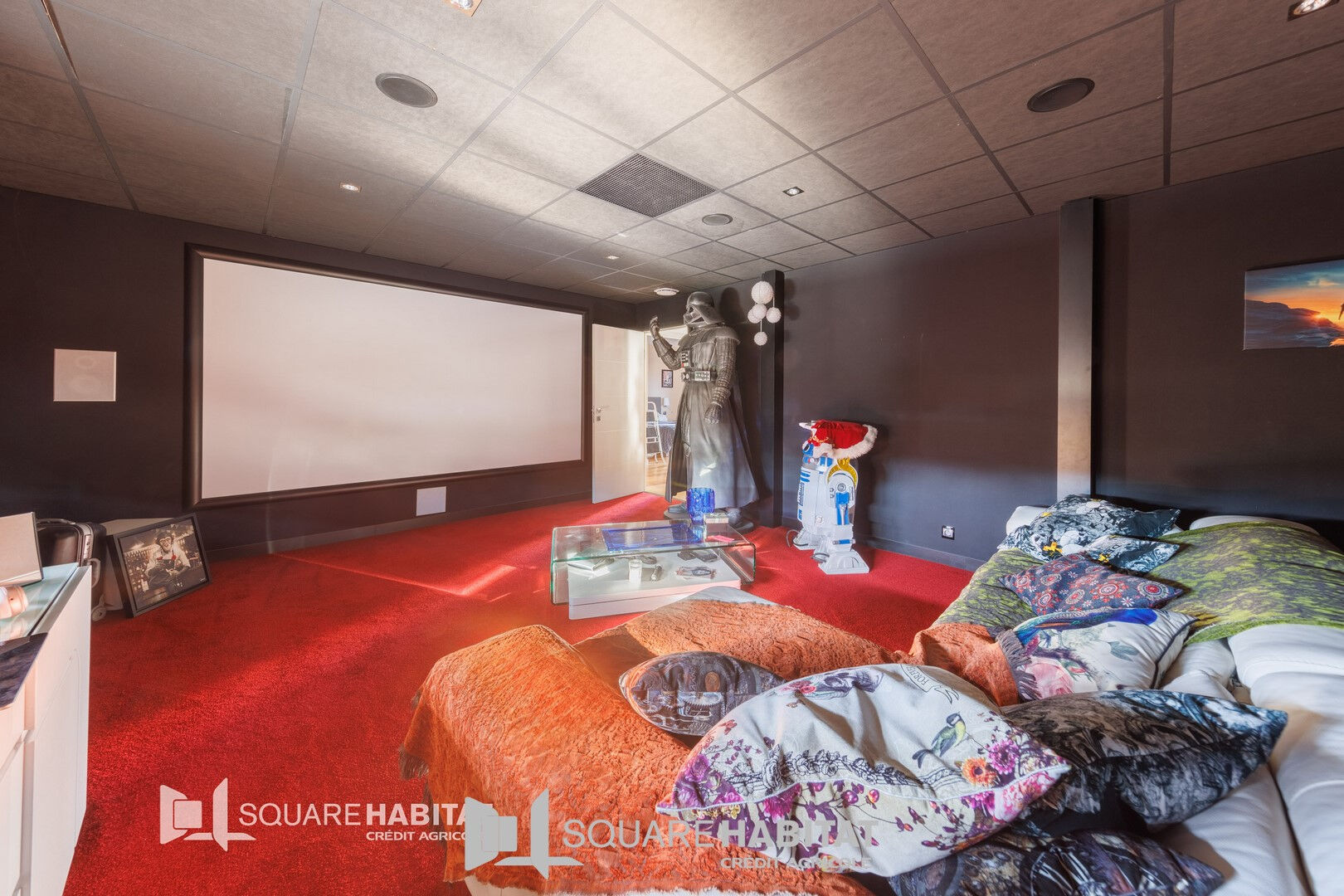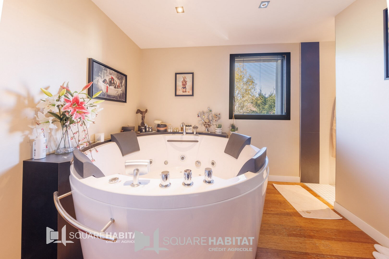 Dès l'entrée, vous serez séduit par une vaste pièce de vie baignée de lumière grâce à de larges baies vitrées, offrant un espace entièrement ouvert et modulable selon vos envies. Cet espace s'ouvre sur deux terrasses : l'une intimiste avec vue en hauteurs sur la ville, l'autre tournée vers la nature pour des moments de calme et de sérénité., cuisine équipée, cellier aménagé, salon, suite parentale avec dressing et salle de bain avec baignoire bal néo, home cinéma, chambre,