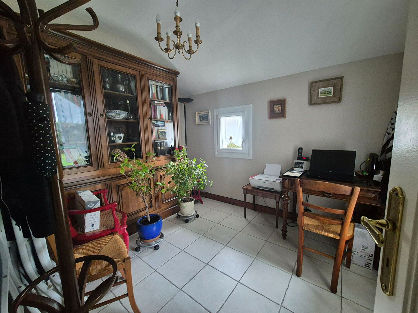 Entrée desservant un salon avec cheminée, un séjour, une cuisine (pouvant être ouverte sur le séjour), un bureau et un WC.