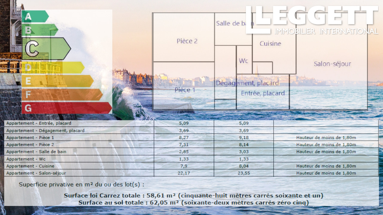 A41831JFD35 - Découvrez cet appartement 3 pièces de 59 m², situé au dernier étage d'une copropriété bien entretenue avec espace vert, dans un secteur calme et idéalement située, dans le quartier recherché de Rochebonne. L'appartement bénéficie d'une très bonne exposition Sud-Ouest, Situé à 500 mètres, 5 minutes à pied de la plage, de la cale de Rochebonne et à seulement 10min à pied des commerces et des commodités duc entre de Paramé. Il se compose d'un salon, d'une cuisine indépendante, de deux chambres sans vis-à-vis, d'une salle de bain et de WC séparés, Appartement libre d'occupation.