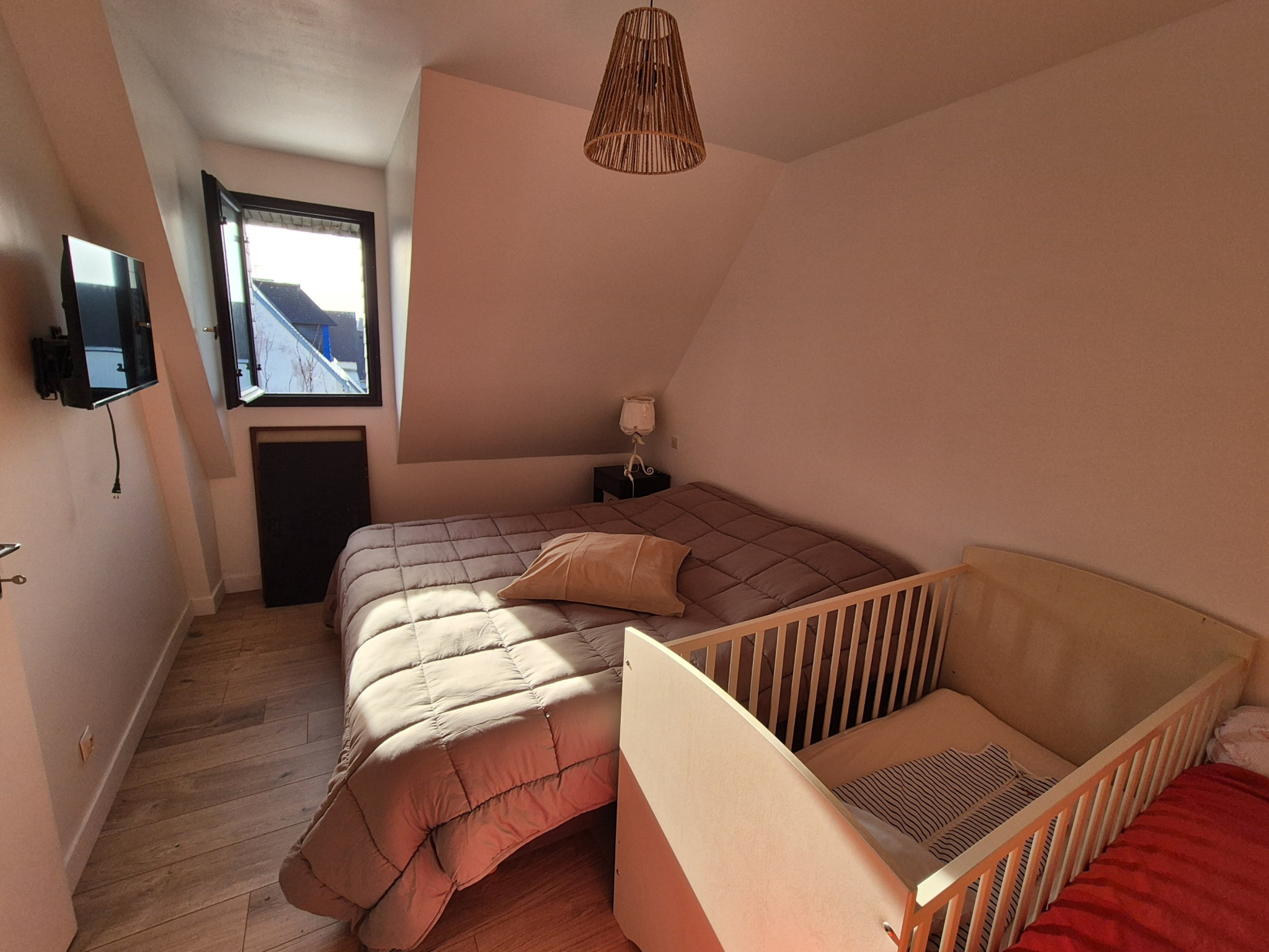 À l'étage : Un pallier dessert deux chambres sous rampants.