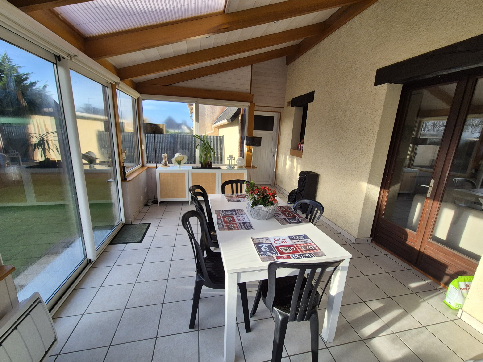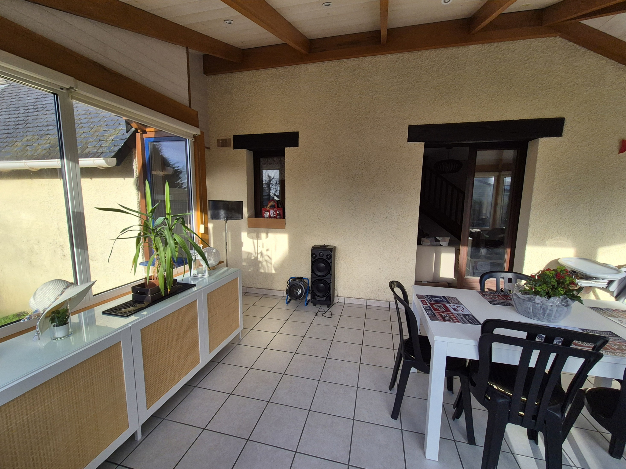 - Pièce de vie lumineuse exposée sud avec cheminée à insert, ouvrant directement sur une véranda chauffée d'environ 17 m2 idéale pour profiter de la lumière toute l'année.