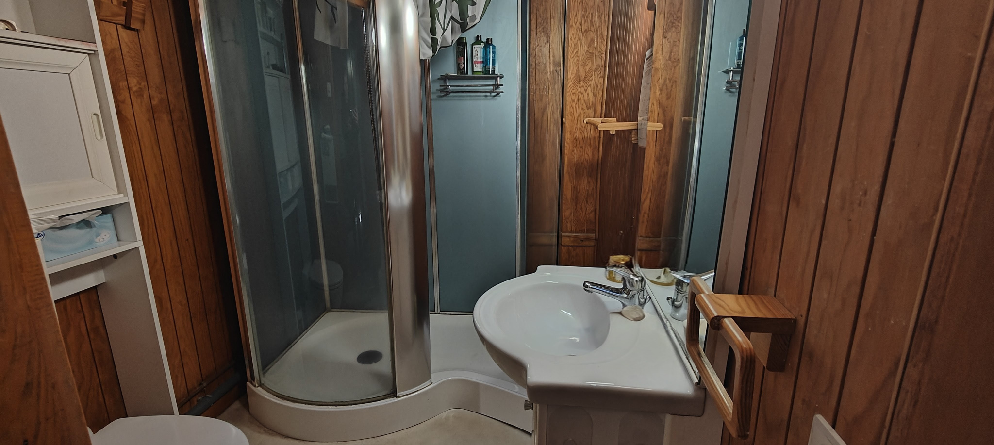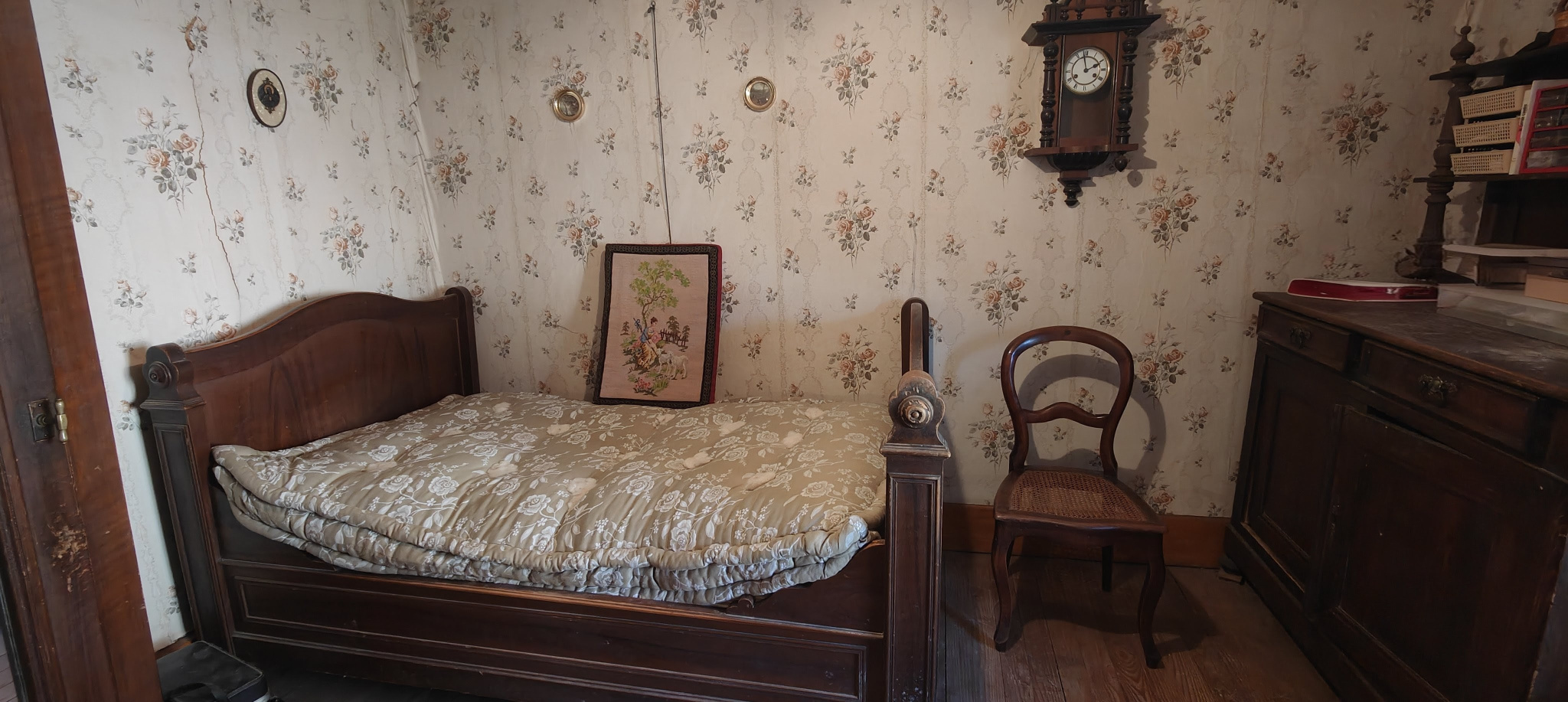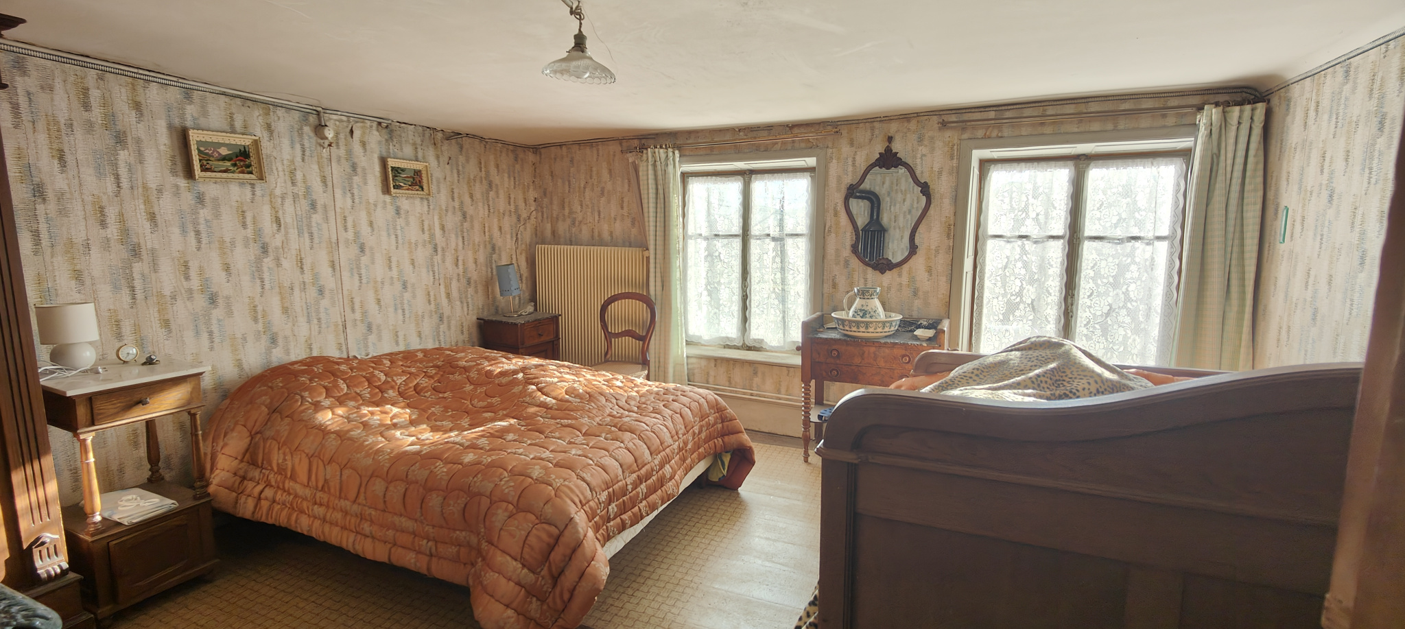 À l'étage, l'espace nuit se compose actuellement de quatre chambres spacieuses et d'une salle d'eau. Bien que la structure soit saine, cette propriété de 132 m2 nécessite un projet de rénovation totale pour retrouver son éclat d'antan. Il faudra ainsi prévoir l'installation de doubles vitrages, une isolation complète, la mise aux normes de l'électricité, le remplacement du chauffage au fuel ainsi que le remplacement complet de la couverture. La bâtisse est raccordée au tout à l'égoût.