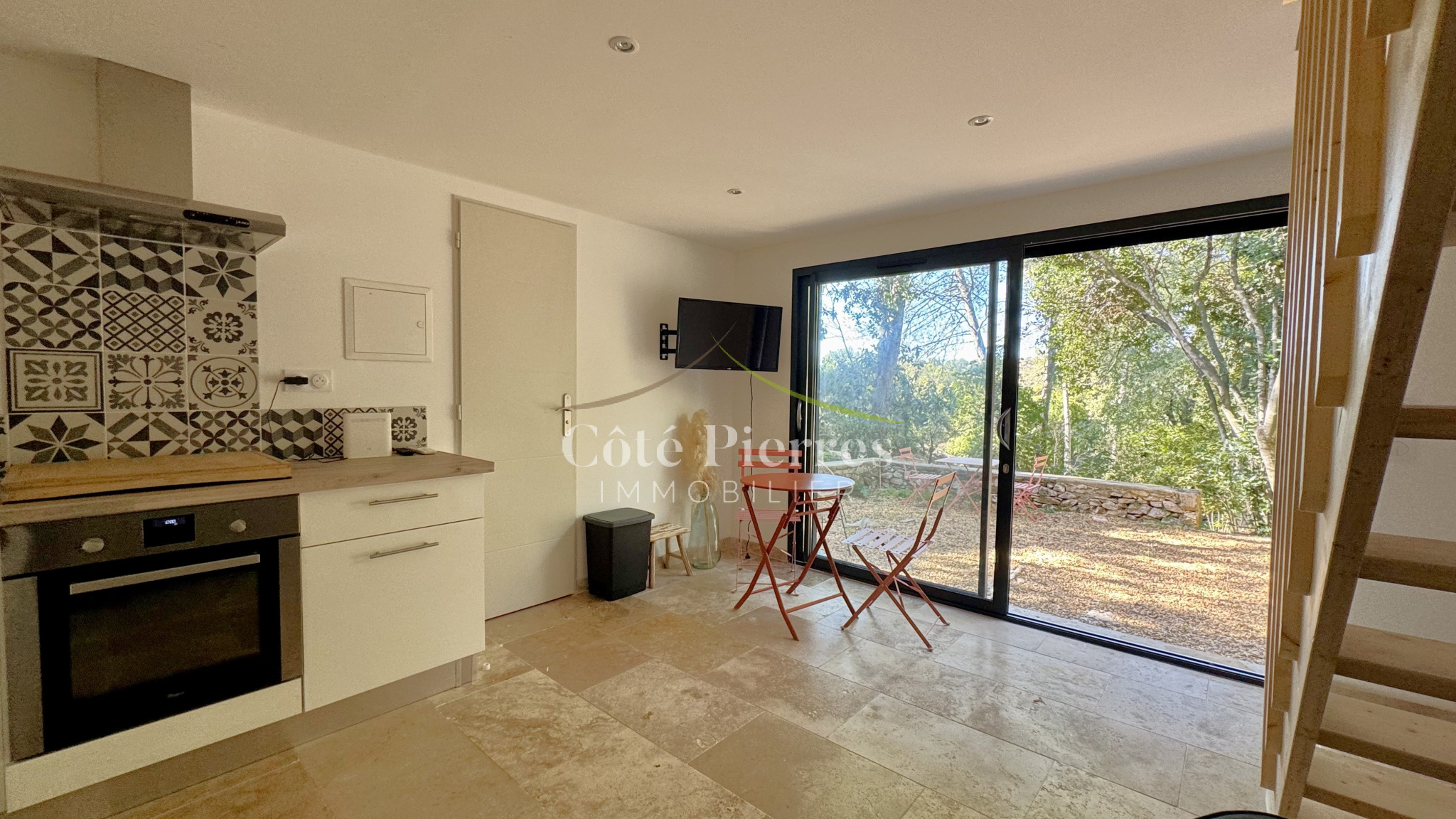 Dès l'entrée, la pièce de vie baignée de lumière offre un bel espace avec cuisine ouverte,donnant directement sur l'exterieur grâce à sa grande baie vitrée.