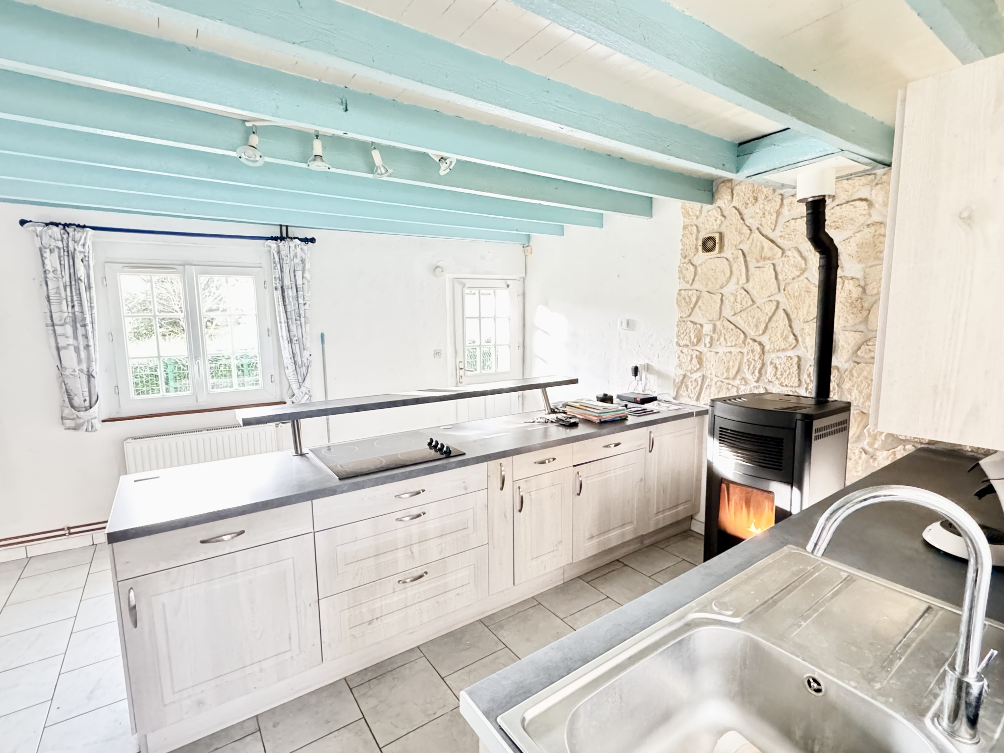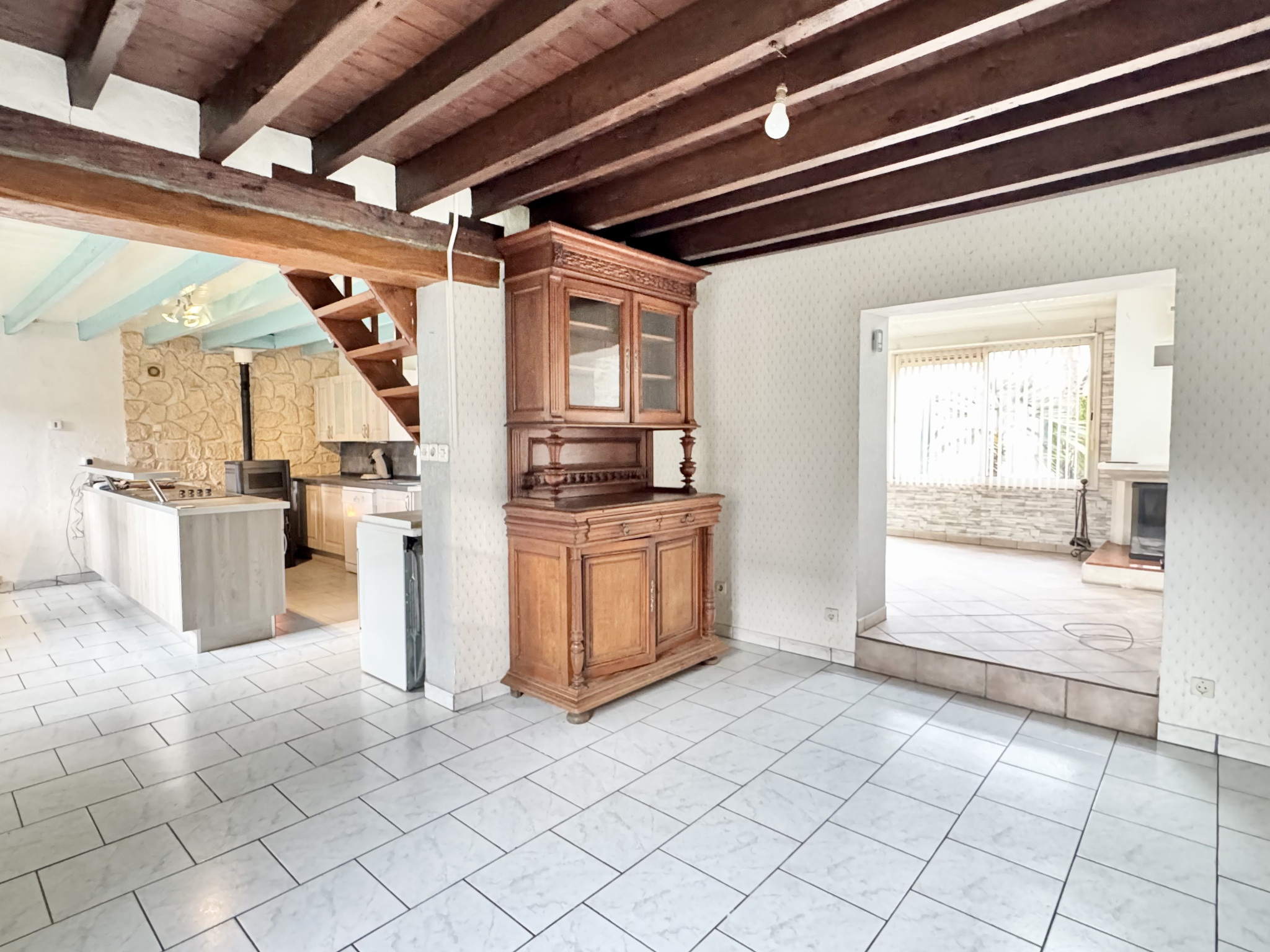 Une pièce à vivre lumineuse ouverte sur une grande véranda équipée d'une cheminée avec insert bois, parfaite pour profiter d'une ambiance chaleureuse toute l'année,