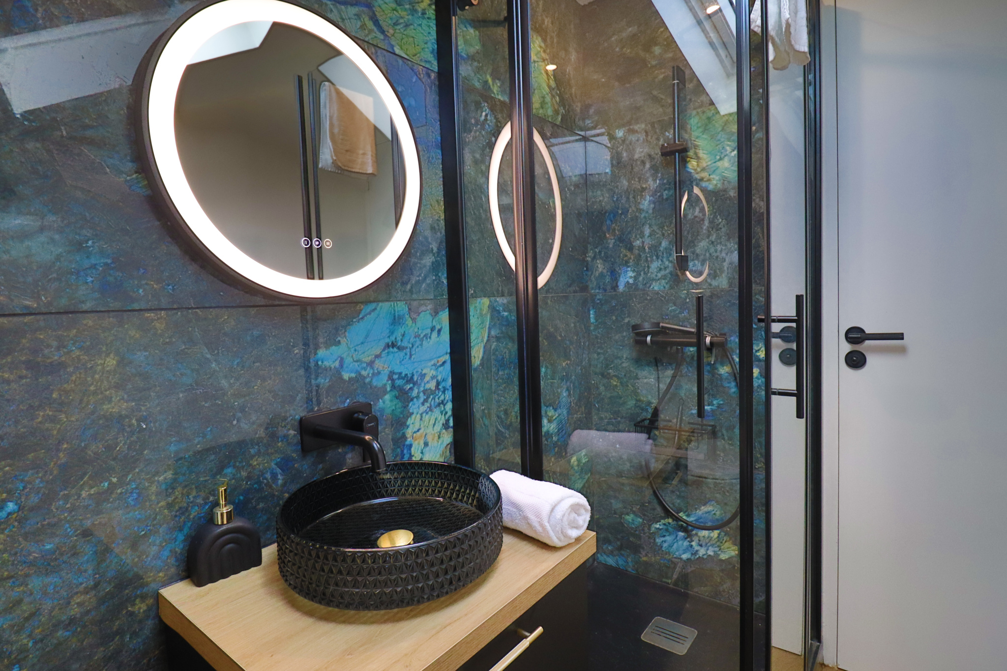 ainsi qu'une superbe salle d'eau contemporaine avec WC, aux lignes modernes.