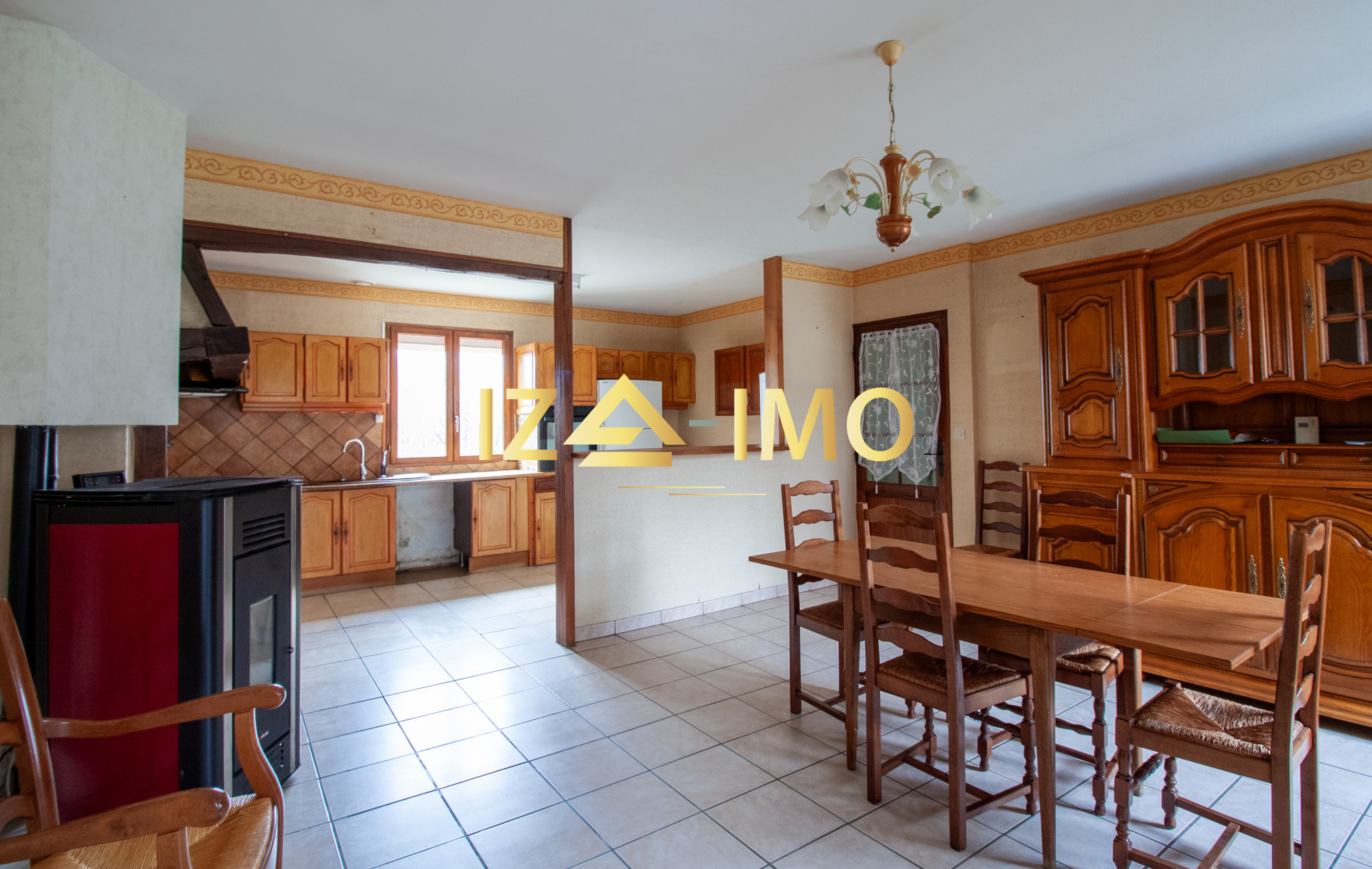 Au rez-de-chaussée, une cuisine aménagée s'ouvre sur une lumineuse pièce de vie équipée d'un poêle à granulés, créant une atmosphère chaleureuse. Une véranda prolonge agréablement cet espace et permet de profiter d'une vue dégagée sur l'extérieur tout au long de l'année.