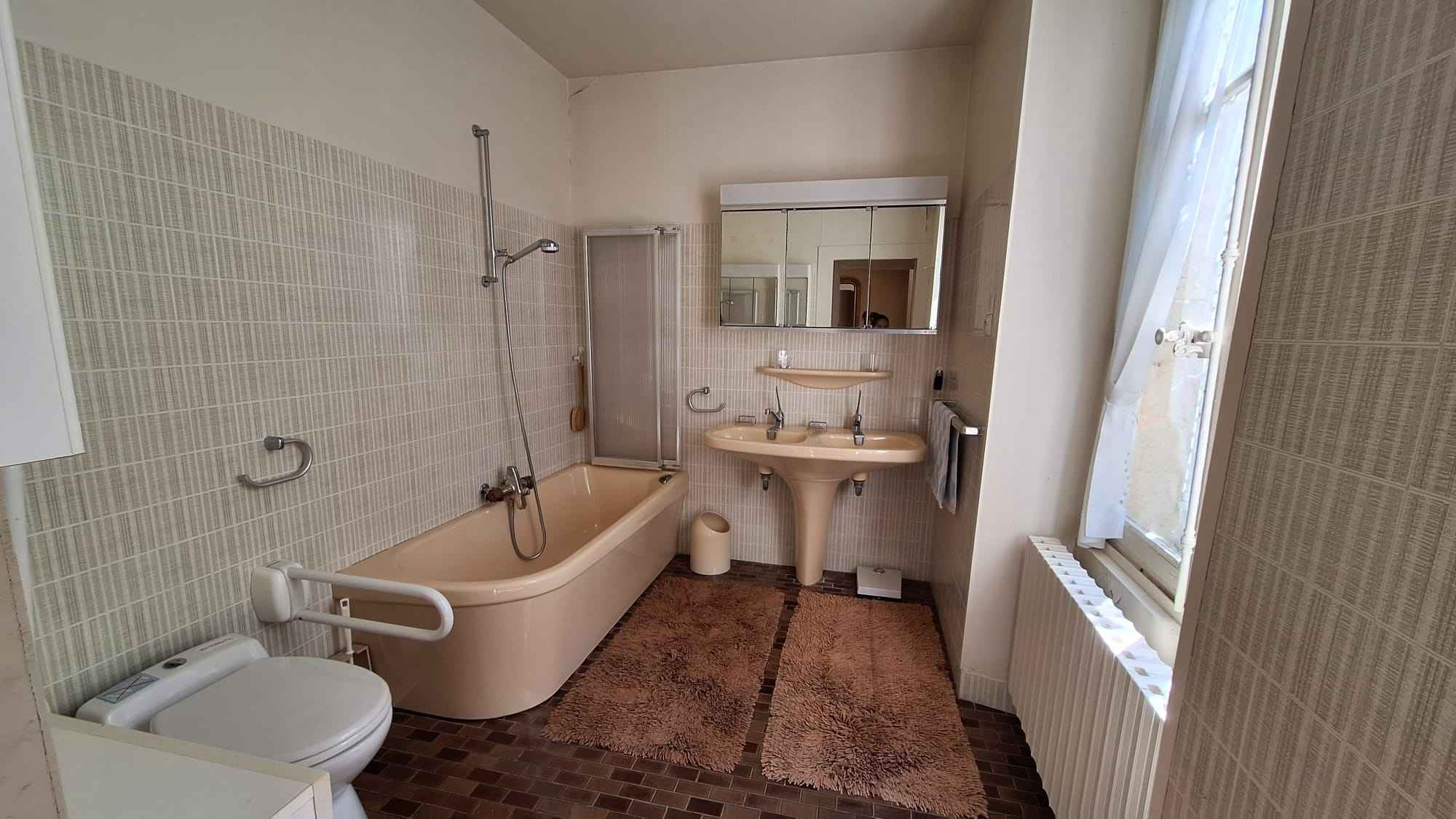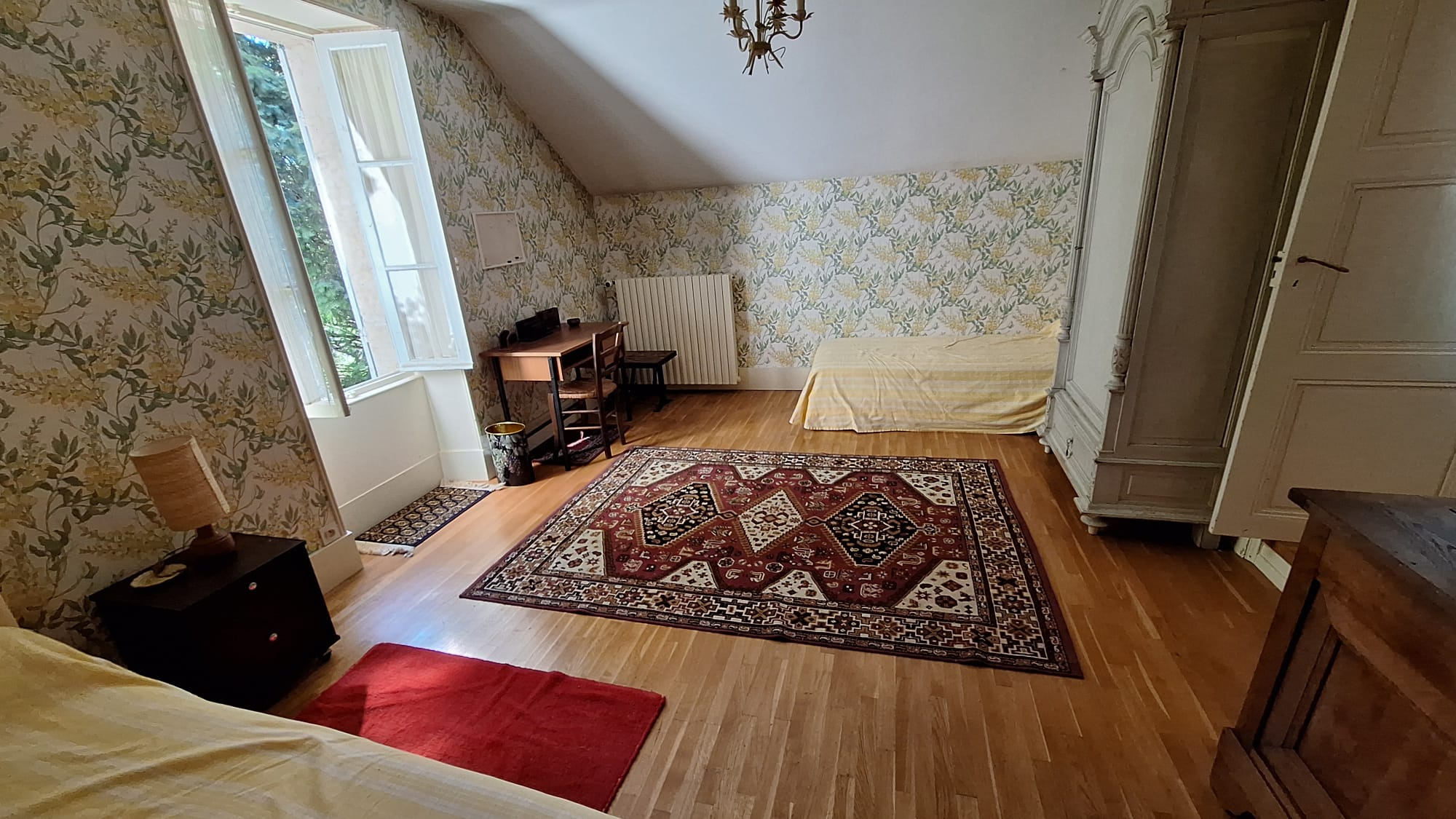 À l'étage : chambre avec sanitaires, vaste séjour et grenier