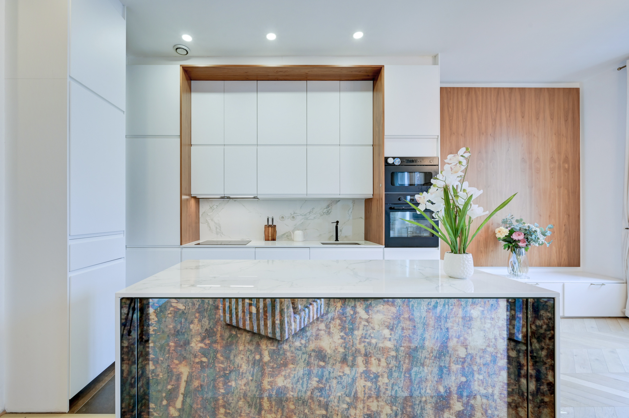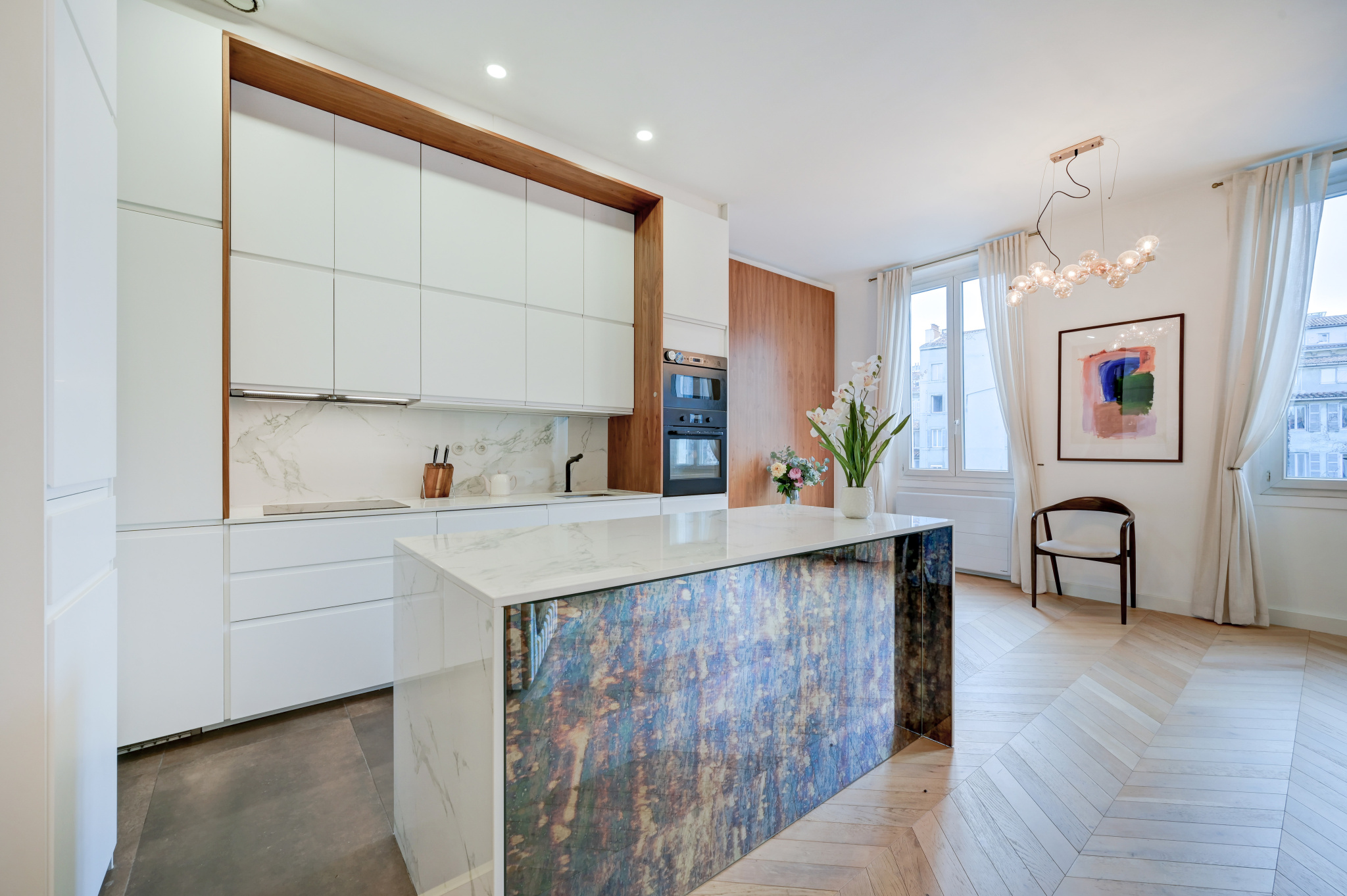 Situé au dernier étage avec ascenseur, cet appartement de 140 m2 Carrez, entièrement rénové avec goût avec des prestations de qualité et des finitions soignées, séduit par ses volumes généreux et sa hauteur sous plafond de 3,20 m. Au premier niveau, vous découvrirez une vaste pièce de vie lumineuse sublimée par une cheminée bioéthanol, une cuisine aménagée ouverte, intégralement équipée, ainsi qu'une spacieuse suite comprenant un coin dressing, un espace buanderie et une grande salle d'eau. (possibilité d'aménager deux chambres au 1er niveau grâce à la très grande suite existante). À l'étage, deux grandes chambres se partagent une salle d'eau. Sur ce même niveau, une superbe terrasse de 30 m2, exposée plein sud, et aménagée avec une cuisine d'été,offre un véritable espace de vie extérieur, idéale pour profiter pleinement de l'art de vivre marseillais. Immeuble au charme intemporel, toiture et façade rénovées.