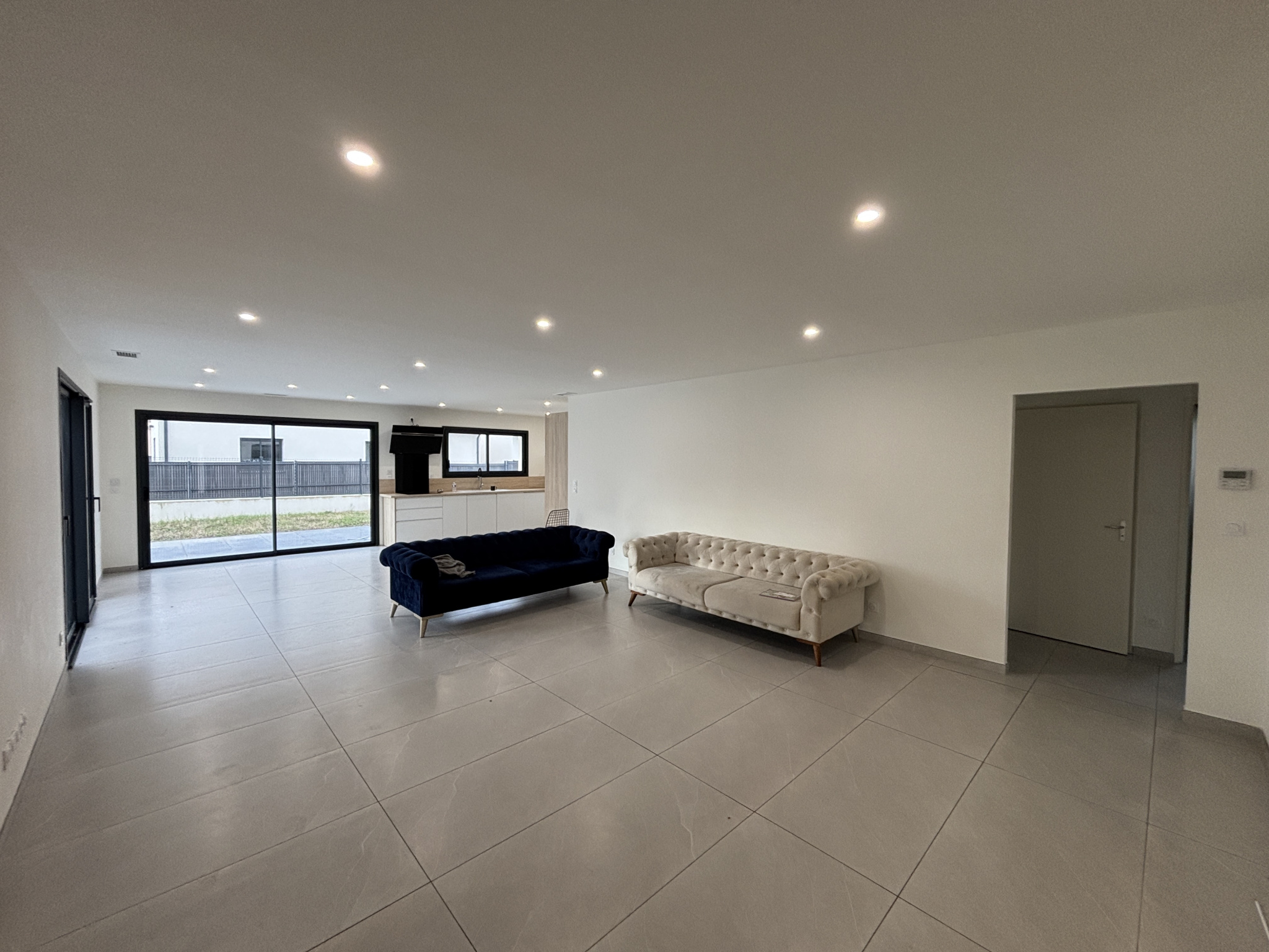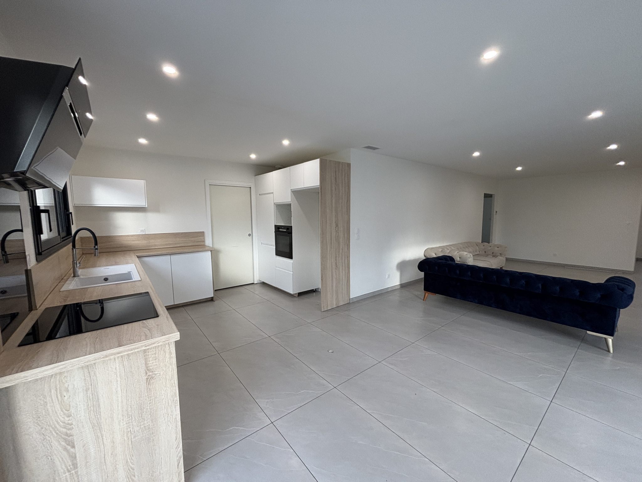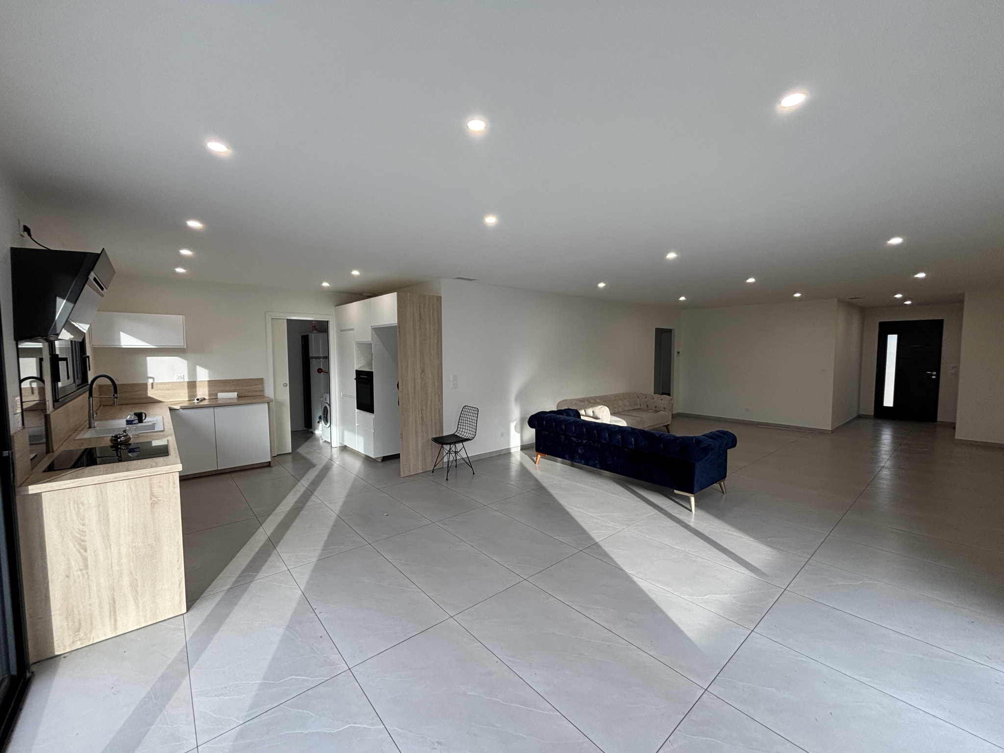 Elle se compose d'une grande pièce de vie de 60m2 avec cuisine ouverte meublée et équipée ayant accès à la buanderie.