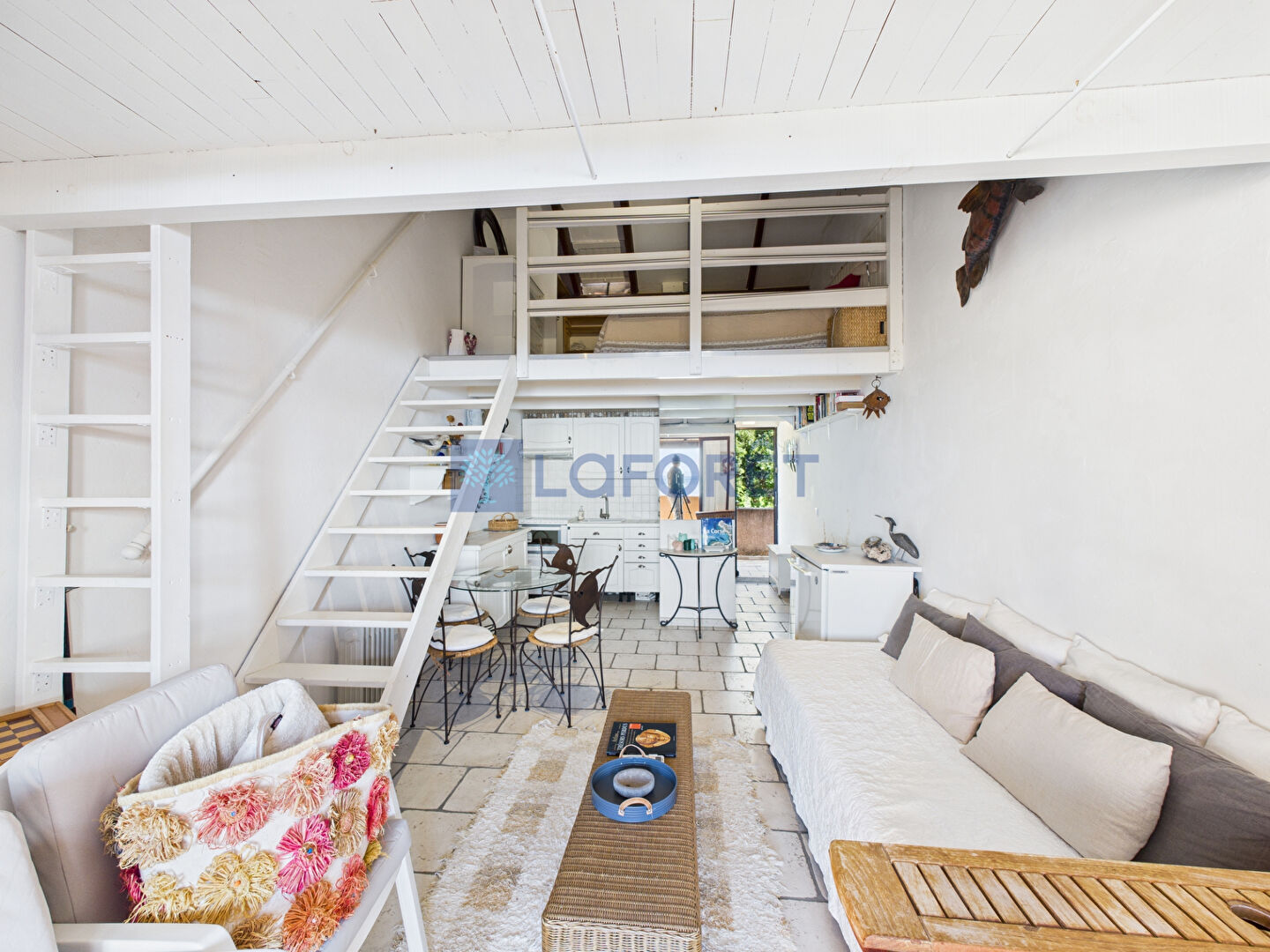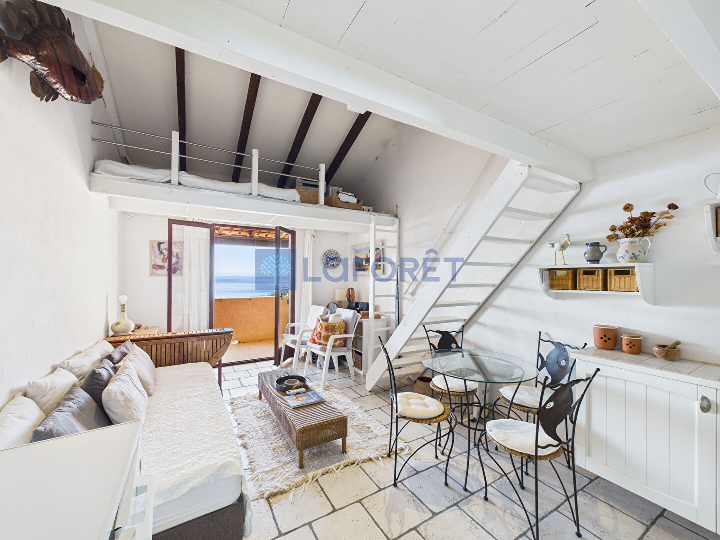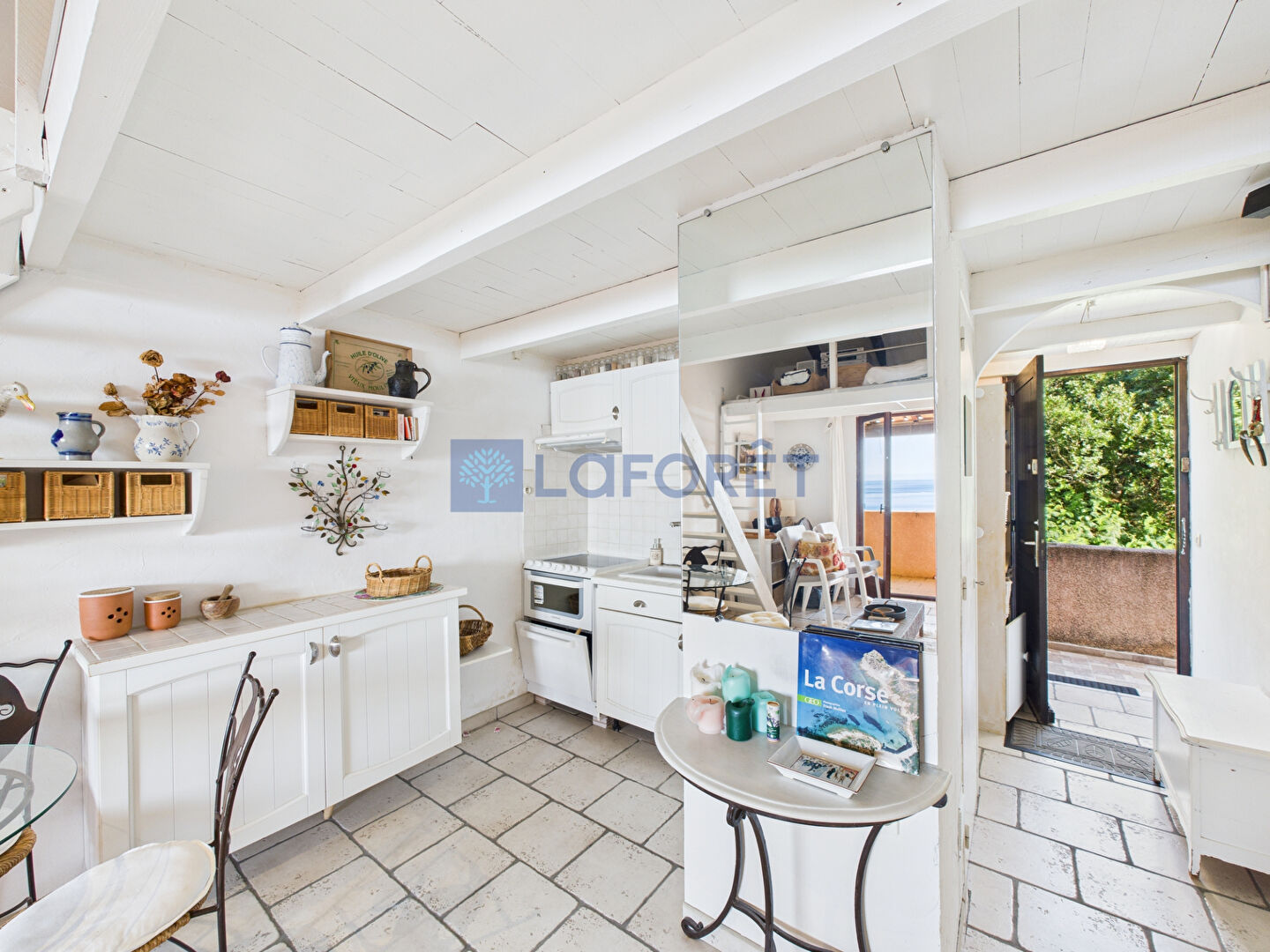 À l'étage, une chambre en mezzanine permet d'optimiser l'espace tout en conservant une atmosphère chaleureuse et authentique, idéale pour une résidence secondaire ou un pied-à-terre en Corse.