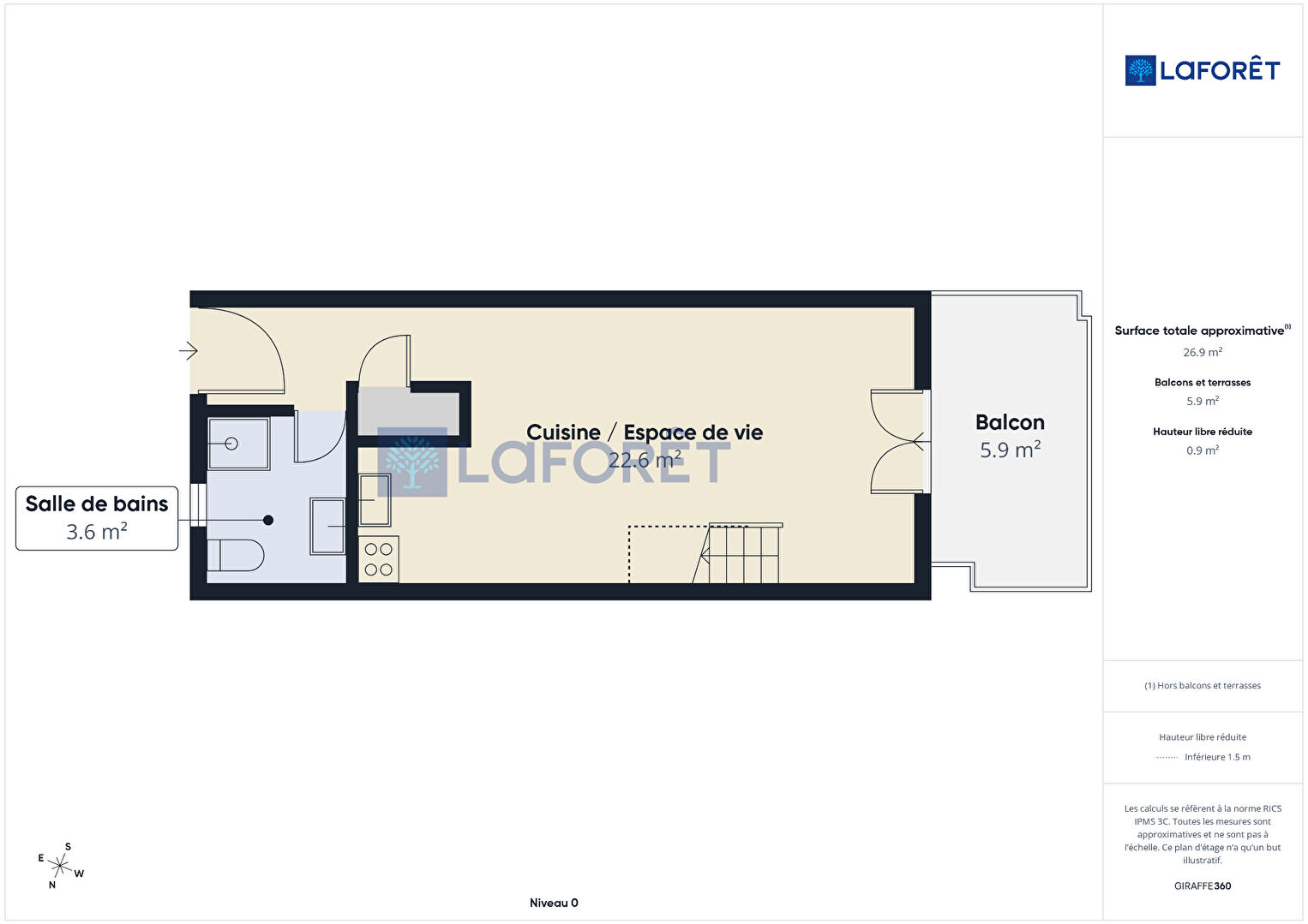 D'une surface d'environ 36,7 m², il se compose au niveau principal d'un bel espace de vie lumineux avec cuisine ouverte, donnant accès à un balcon de 5,9 m² offrant une vue mer panoramique absolument magnifique.