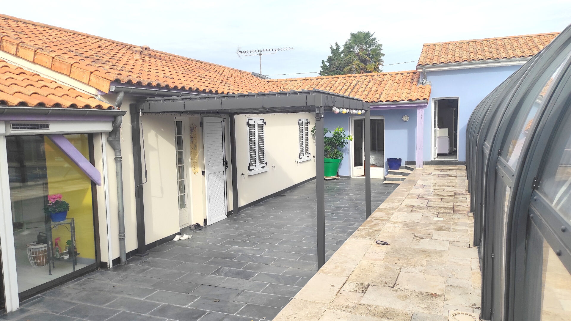 Grande terrasse avec piscine couverte et dépendances.