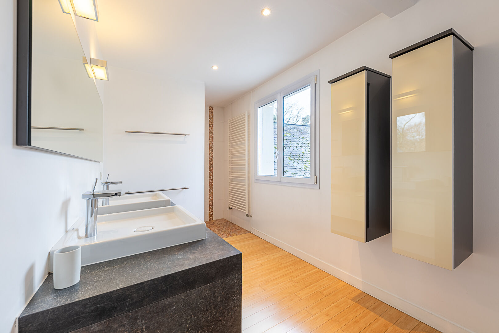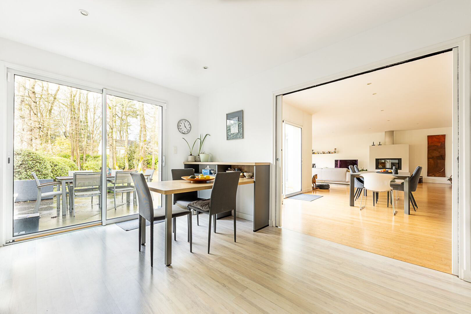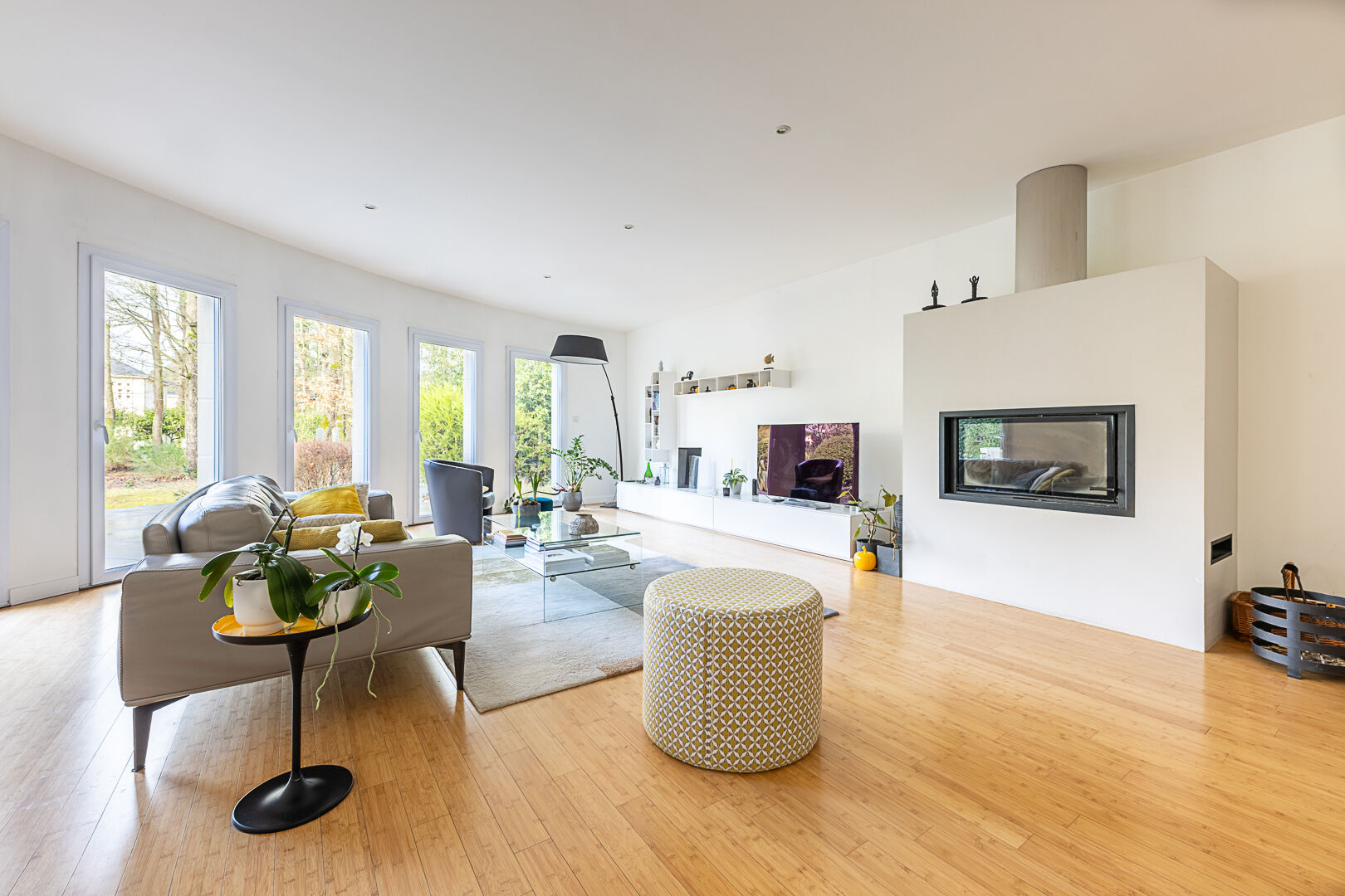 Ici, le temps semble ralentir, bordée par la nature et proche de l'étang Saint-Nicolas, la propriété dialogue en permanence avec son environnement. Les lignes architecturales laissent toute leur place à la lumière et à l'environnement verdoyant. Dès l'entrée, le regard est happé par une perspective qui nous tire vers le séjour, généreux et baigné de lumière, et s'ouvre naturellement sur une grande terrasse à l'abri des regards. La cuisine, prolongée par une arrière-cuisine, s'intègre harmonieusement à cet espace de vie. La maison offre également des volumes fonctionnels et bien pensés : une chambre de plain-pied avec salle d'eau pour un quotidien confortable, plusieurs pièces annexes et un grand garage. À l'étage, les espaces nuit se déploient avec élégance : quatre chambres réparties sur deux niveaux, accompagnées de salles de bains et de vastes paliers pouvant accueillir bureau, bibliothèque ou espace loisirs.