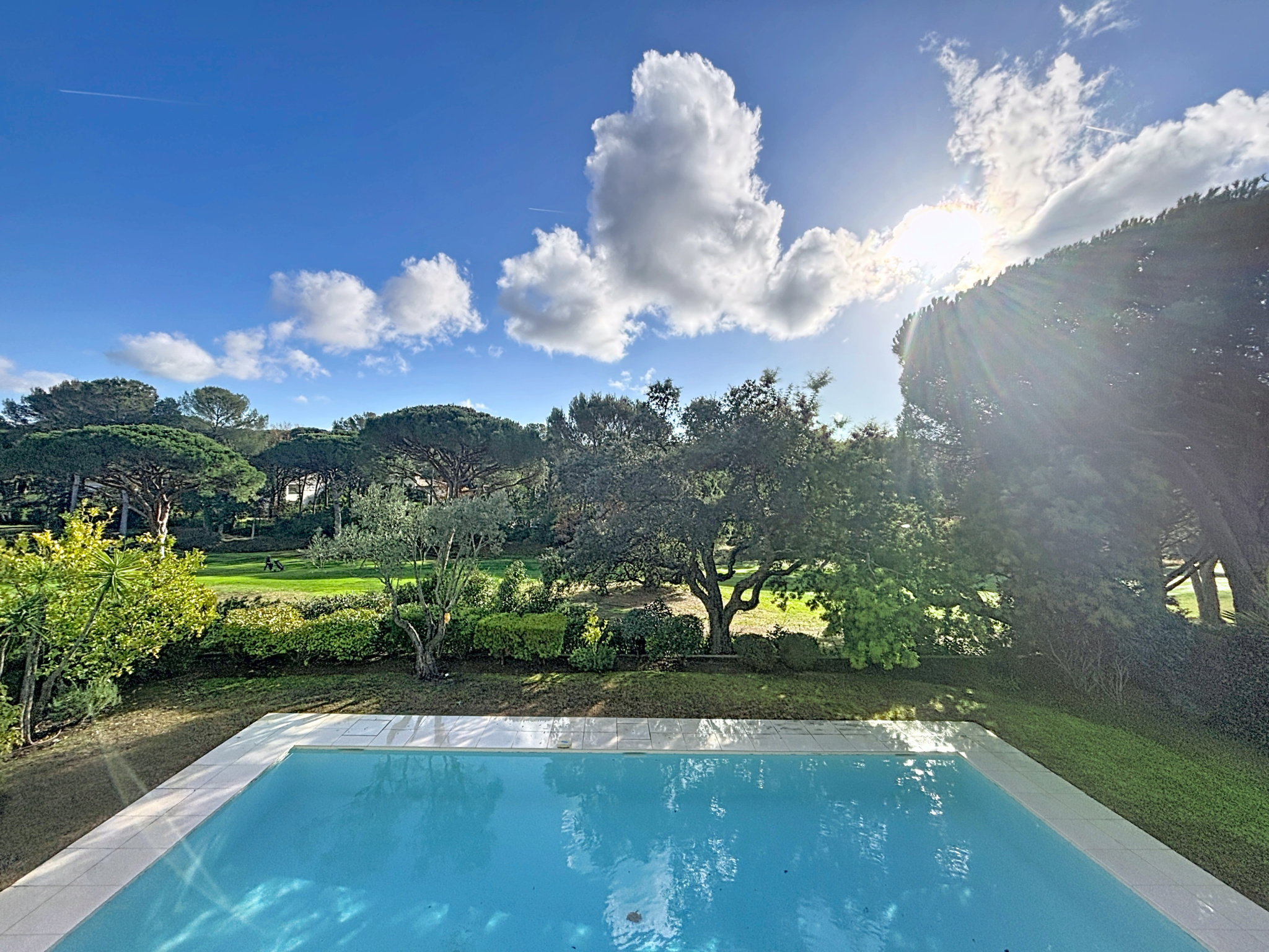 Implantée sur un terrain arboré d'environ 800 m2, la propriété offre de magnifiques espaces extérieurs avec une piscine, propices à la détente face au golf. Un garage ainsi que la possibilité de stationner deux véhicules supplémentaires viennent parfaire les prestations.