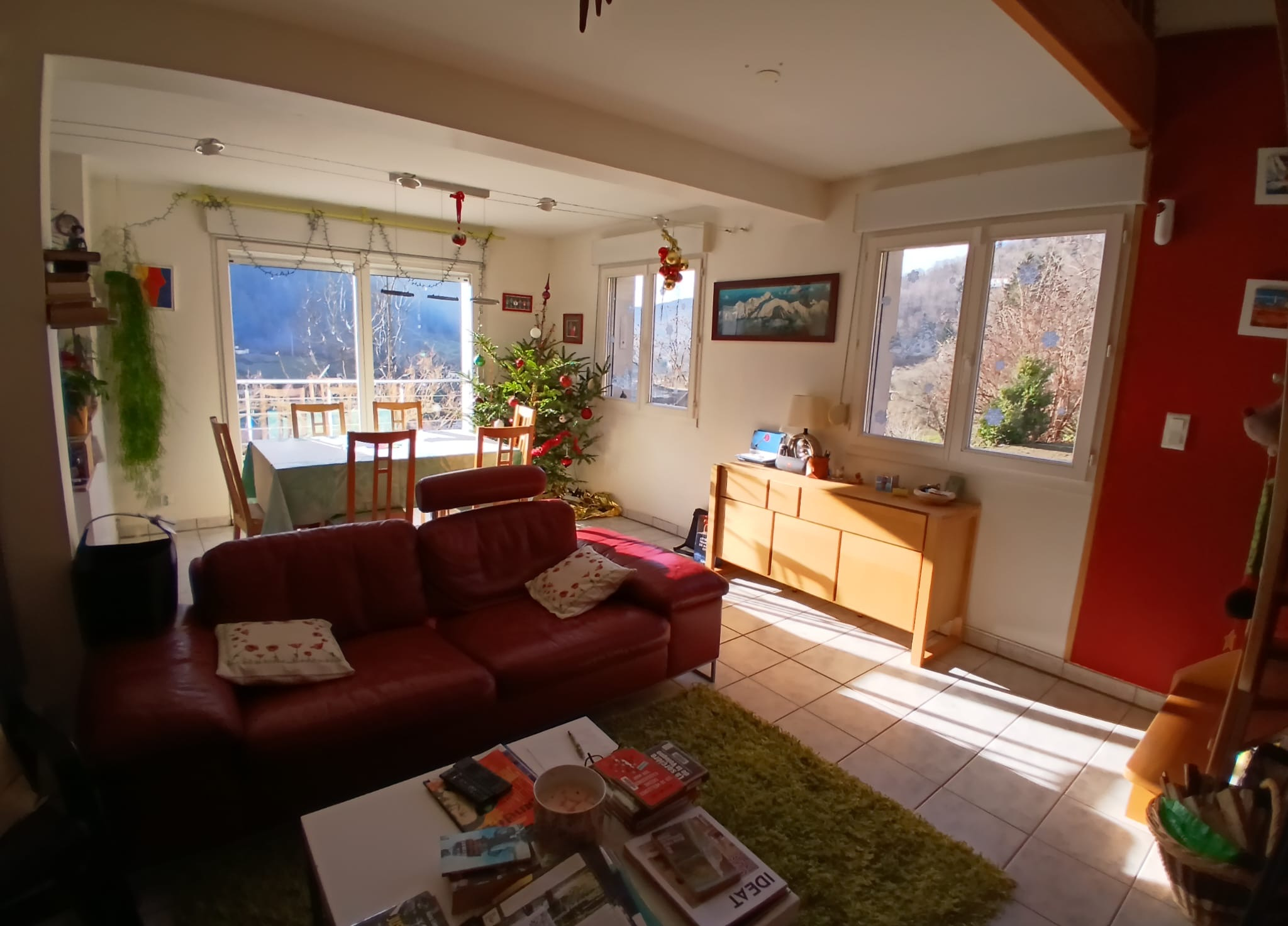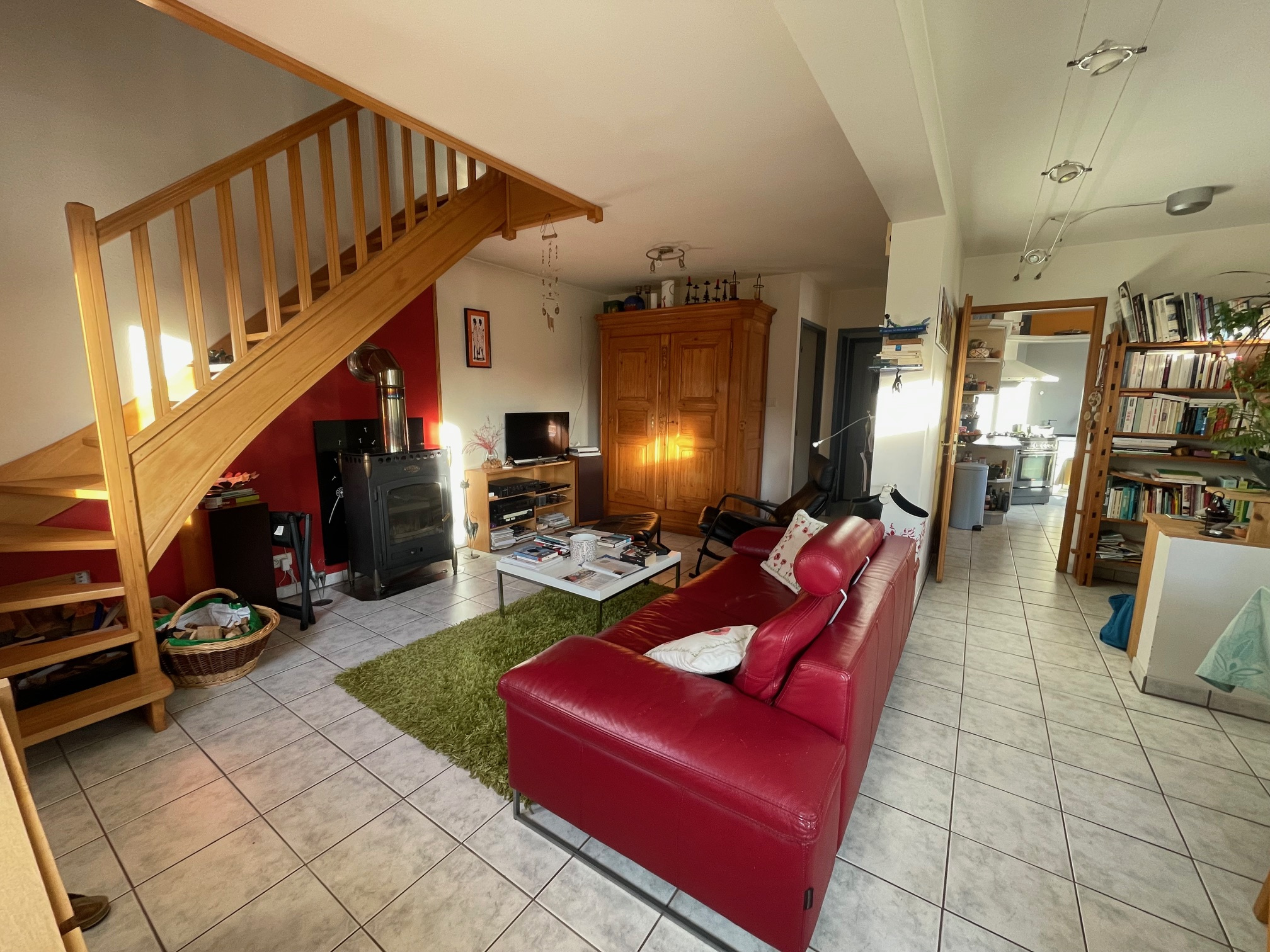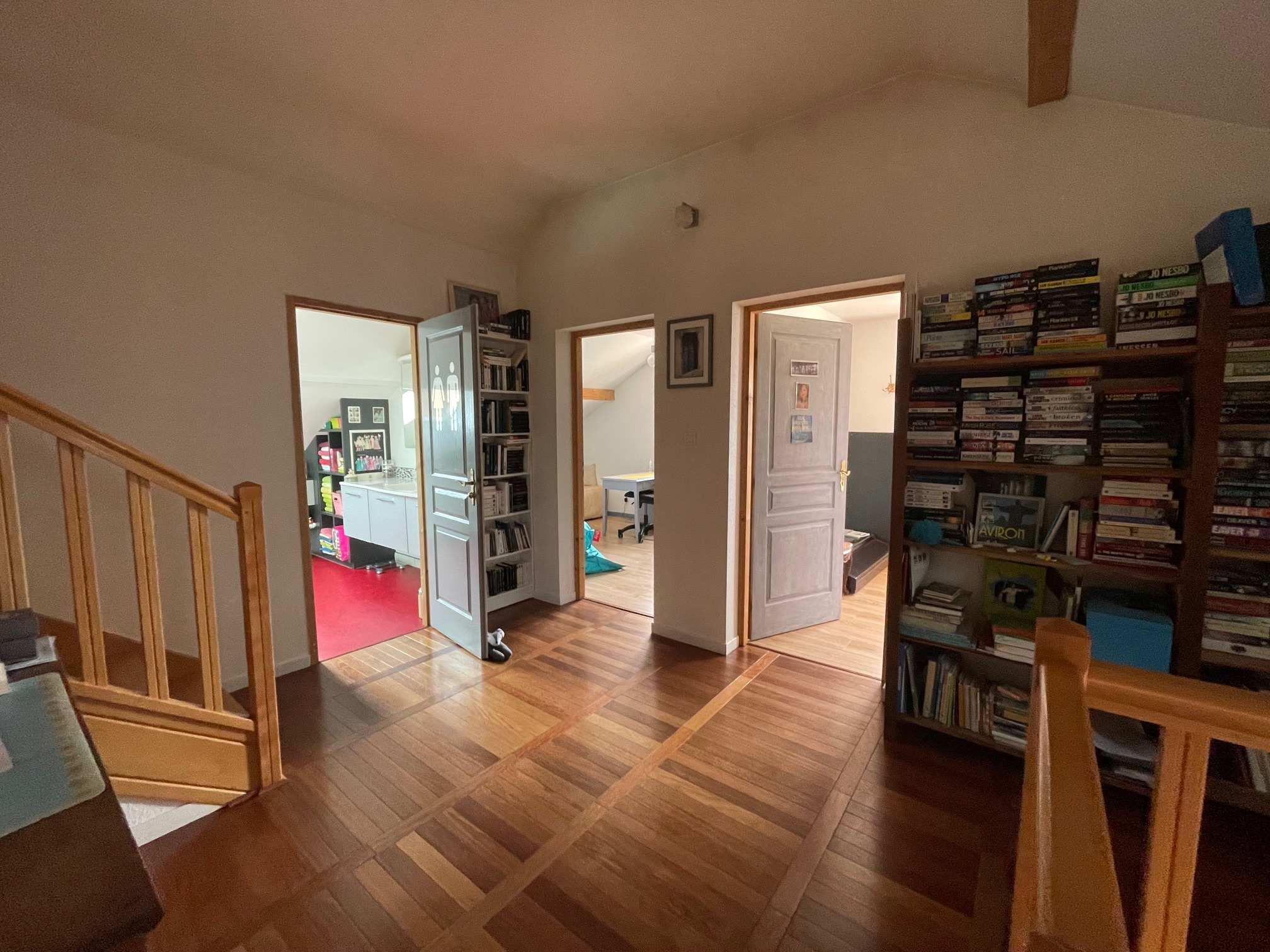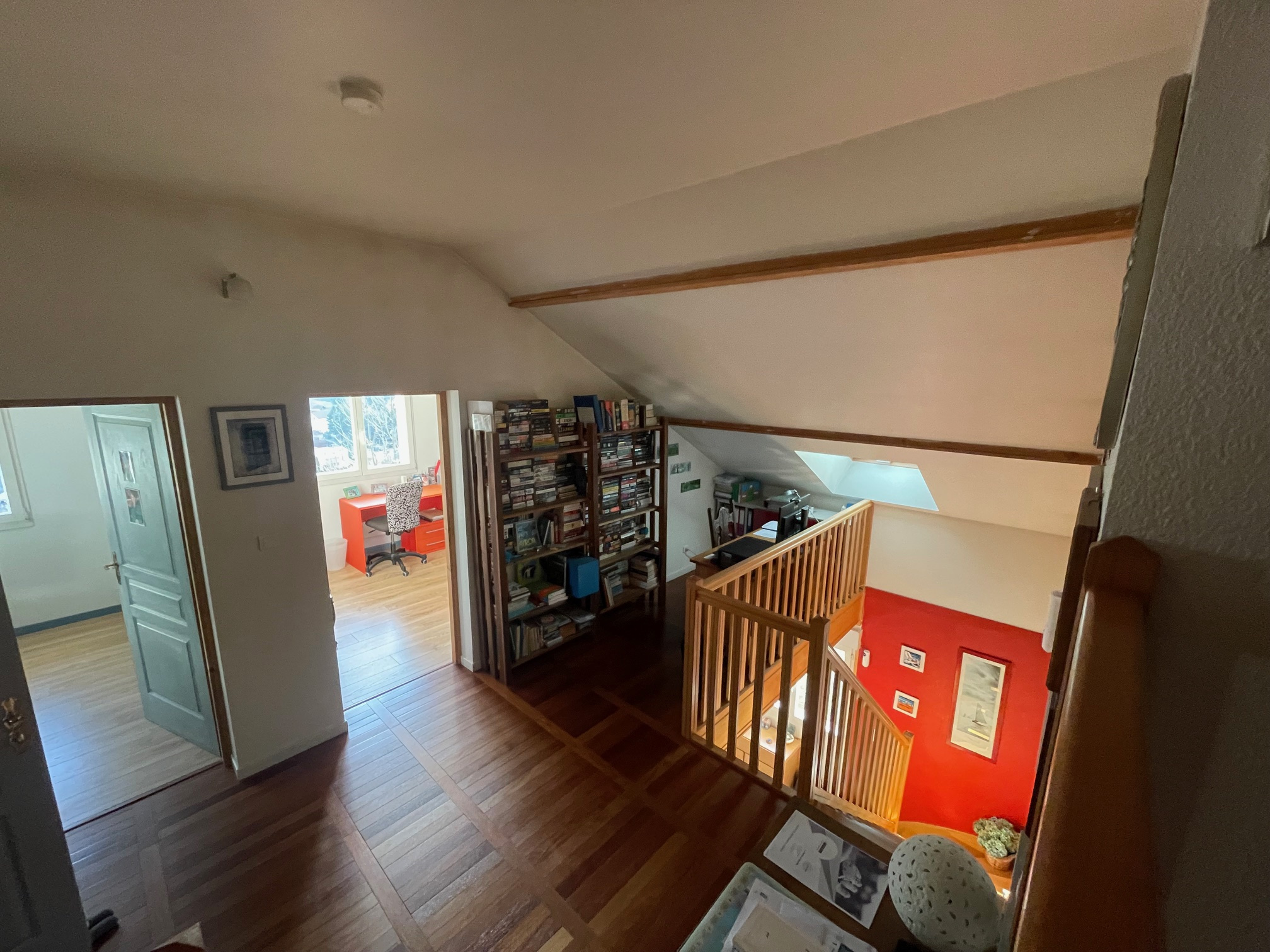 À l'étage : mezzanine/bureau, 2 chambres, salle de douche + WC. Au demi-niveau supérieur : 2 chambres avec placards.
