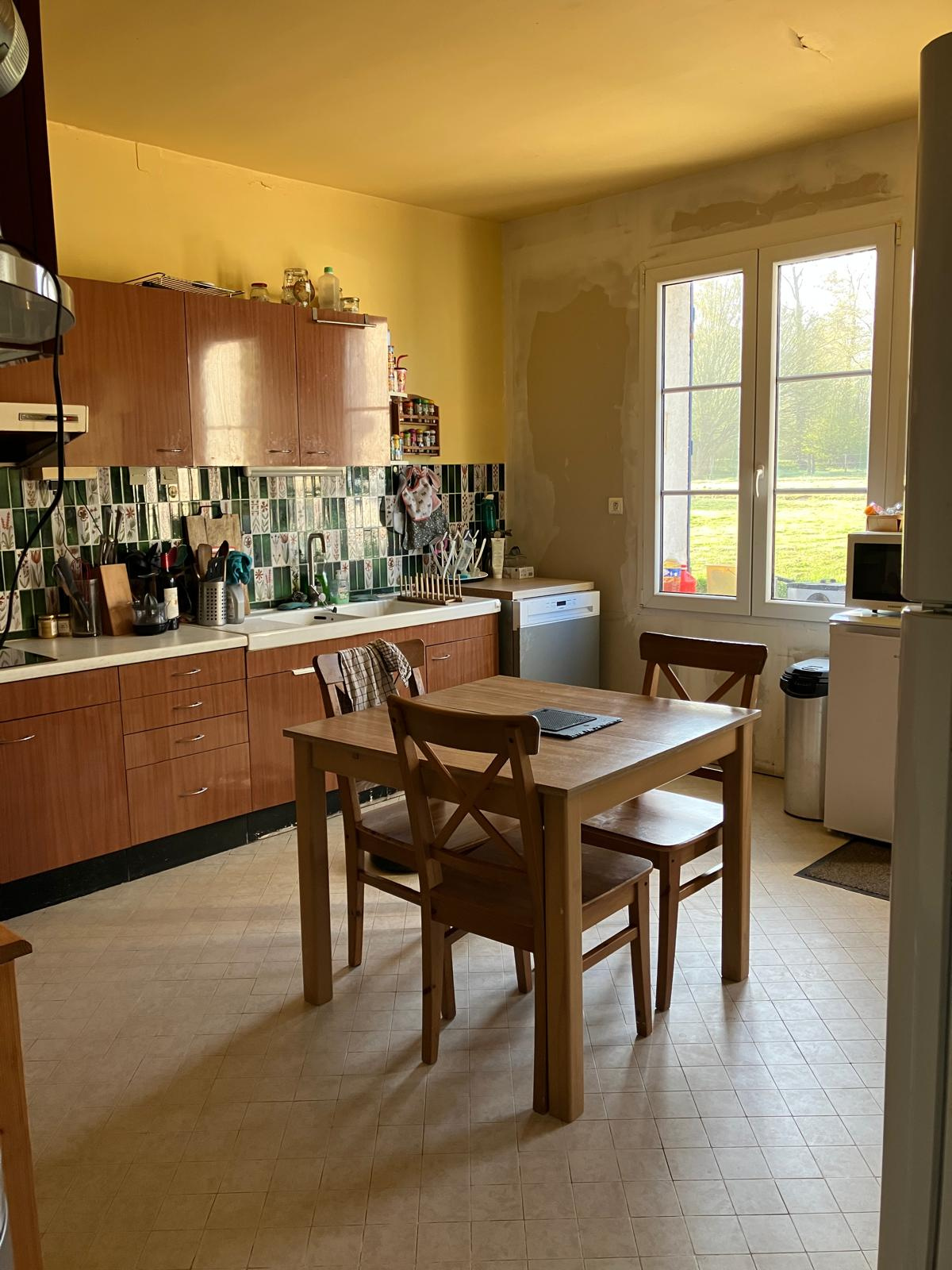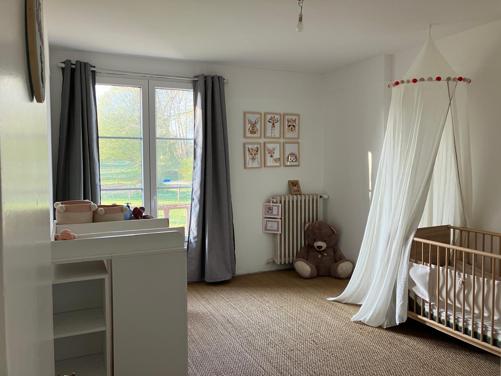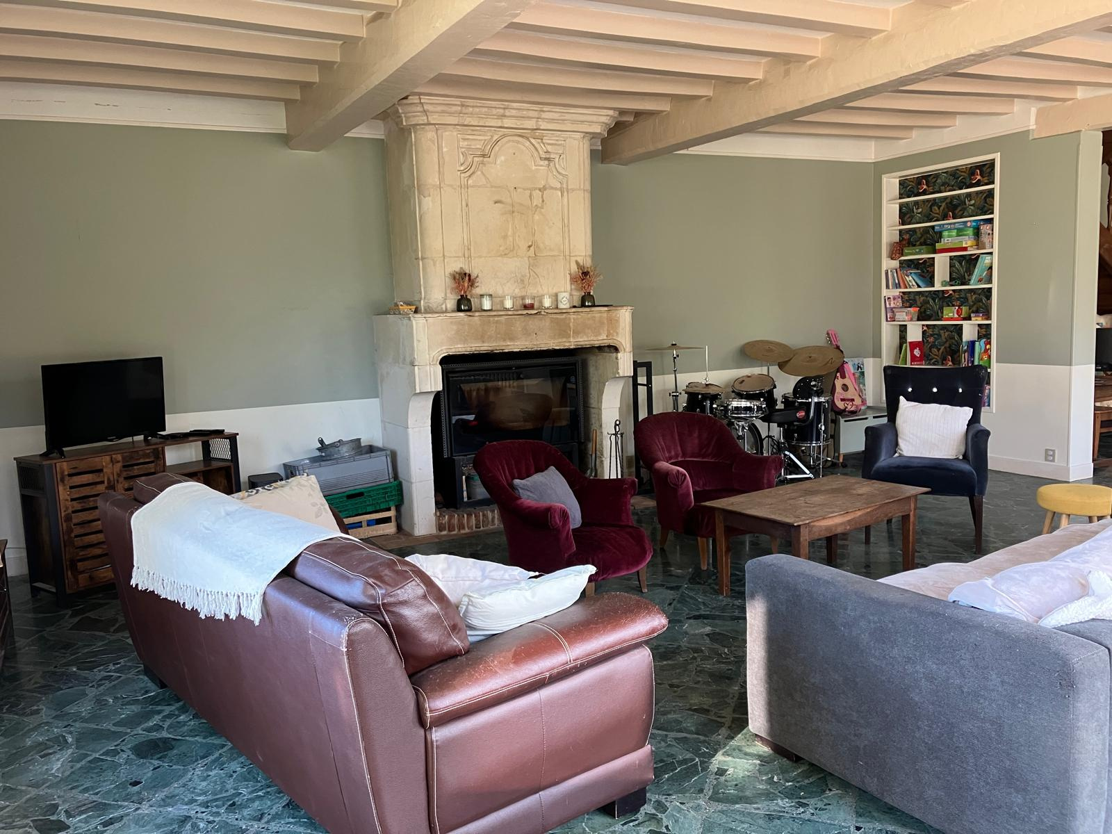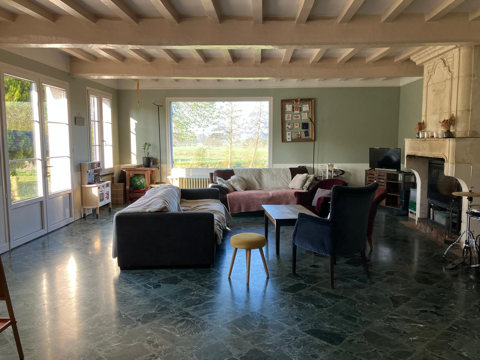Rez de chaussée : Entrée, double séjour/salon avec cheminée/insert avec vue sur la campagne, cuisine aménagée et équipée, couloir avec rangements desservant 2 belles chambres, salle d'eau, wc.