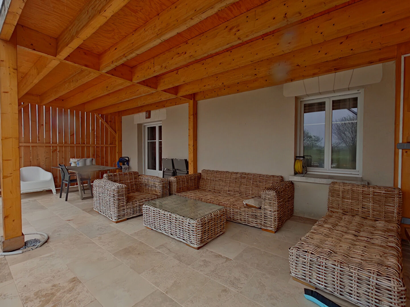 A l'extérieur, terrain entièrement clos et piscine chauffée de 2024 par une pompe à chaleur. Appentis avec panneau photovoltaïque