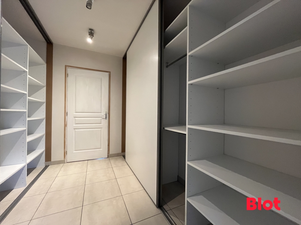 Une suite parentale au rez-de-chaussée se compose d'un grand dressing, d'une chambre et d'une salle de douche spacieuse.