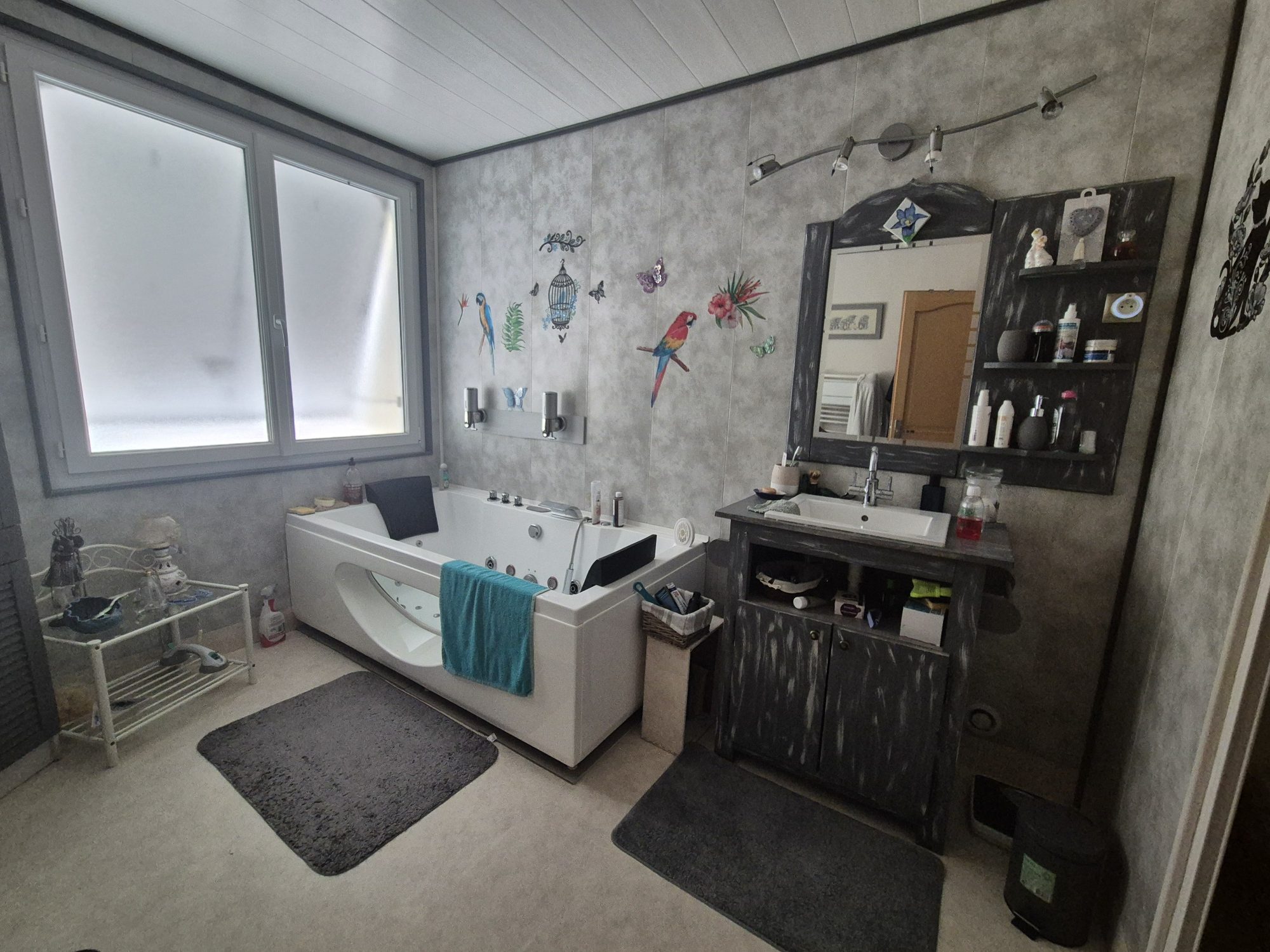 À l'étage : deux chambres confortables, une salle de bain équipée d'une baignoire balnéo et un WC . Un garage attenant vient compléter ce bien, ainsi qu'une agréable terrasse, parfaite pour profiter des beaux jours.