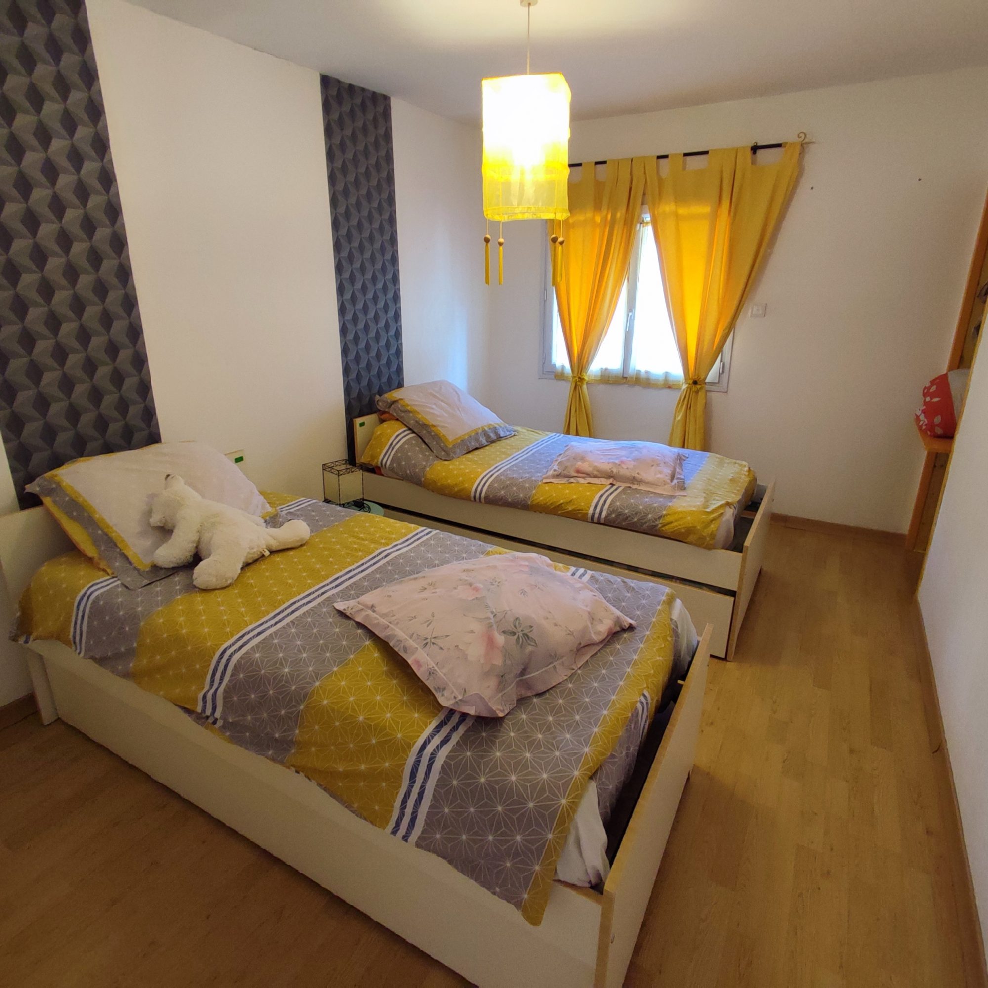 En retrait, un couloir dessert une troisième chambre indépendante avec sa salle d'eau attenante équipée de toilettes, et un garage servant d'atelier.