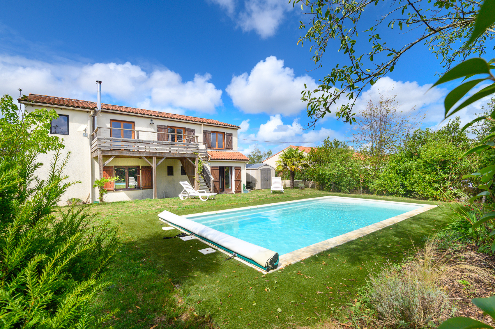Une terrasse bois permettant l'accès à la piscine chauffée (8x3.80m profondeur 1.50) et au jardin arboré sans vis à vis. Garage et stationnements.