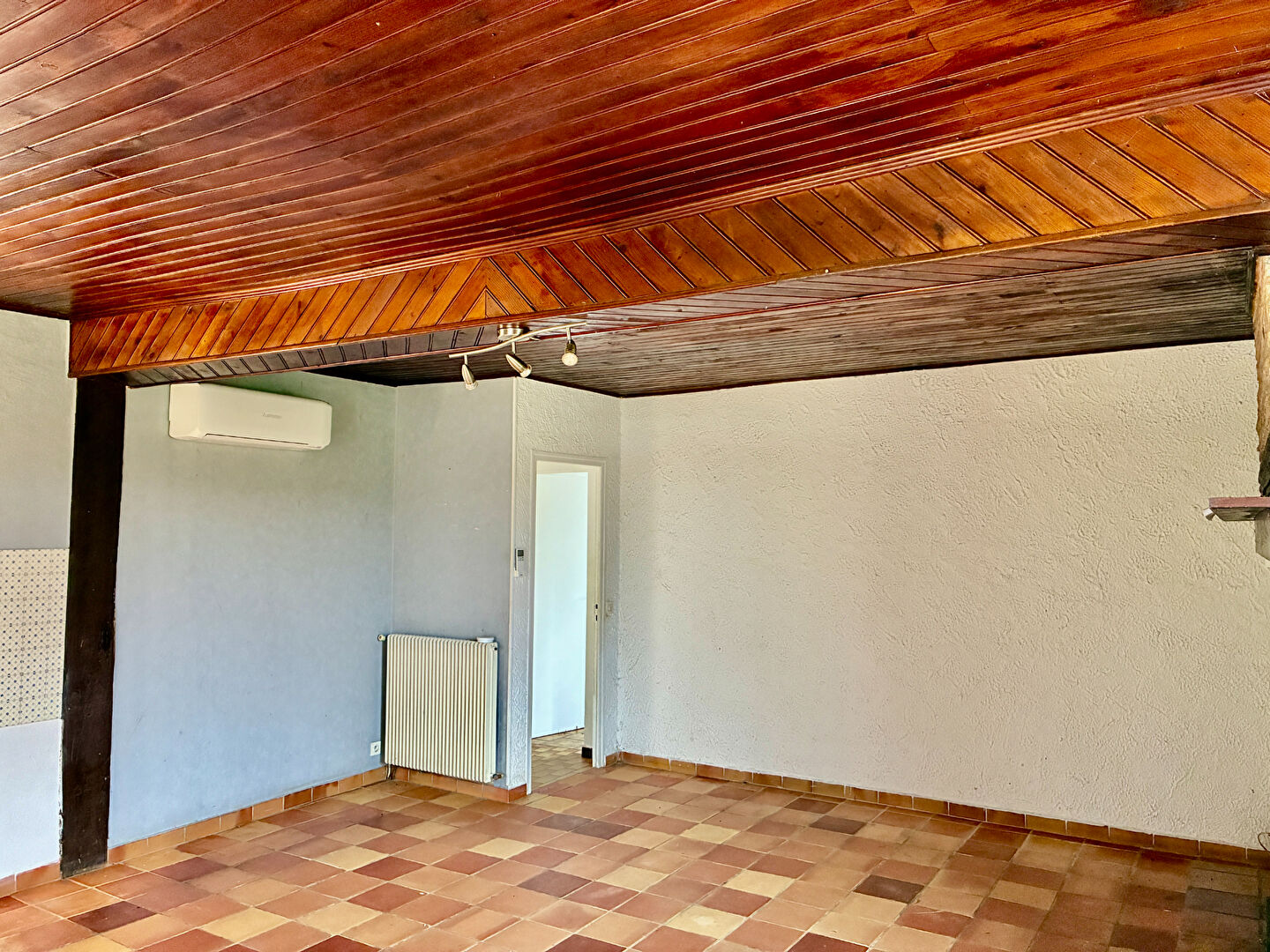 La maison se compose ensuite d'un salon-séjour avec cuisine ouverte, agrémenté d'une cheminée, créant une atmosphère chaleureuse et accueillante.