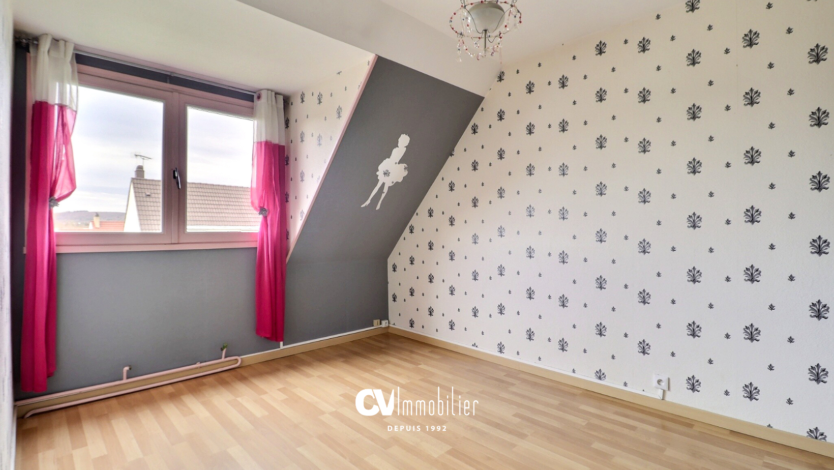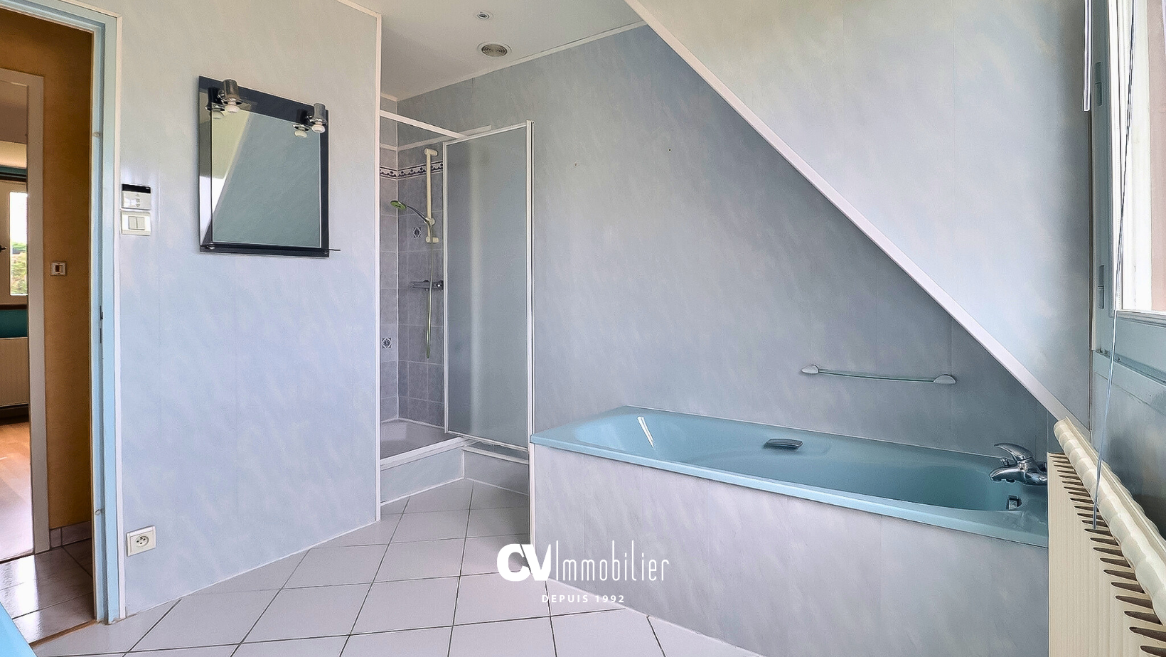 À l'étage : un palier desservant 3 chambres dont une avec rangements, une salle de bains avec douche et un accès aux combles via un escalier escamotable