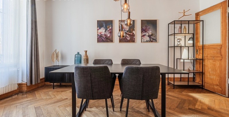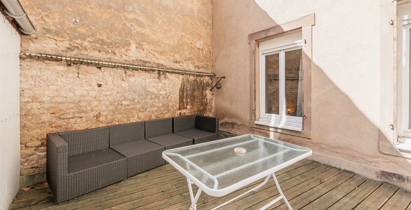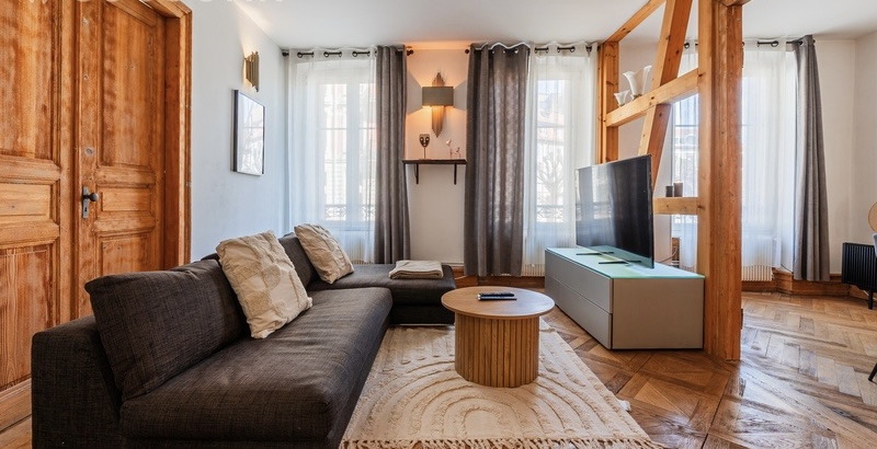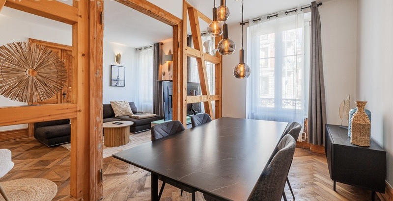 Superbe appartement de 93 m2 avec terrasse privative de 17 m2, offrant de beaux volumes et un charme authentique grâce à ses poutres apparentes présentes dans l'ensemble de l'appartement.