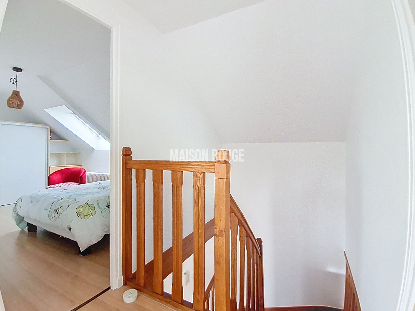 À l'étage, le palier distribue deux chambres avec placards intégrés, un bureau avec rangements pouvant aisément devenir une quatrième chambre, une salle de bains avec WC.