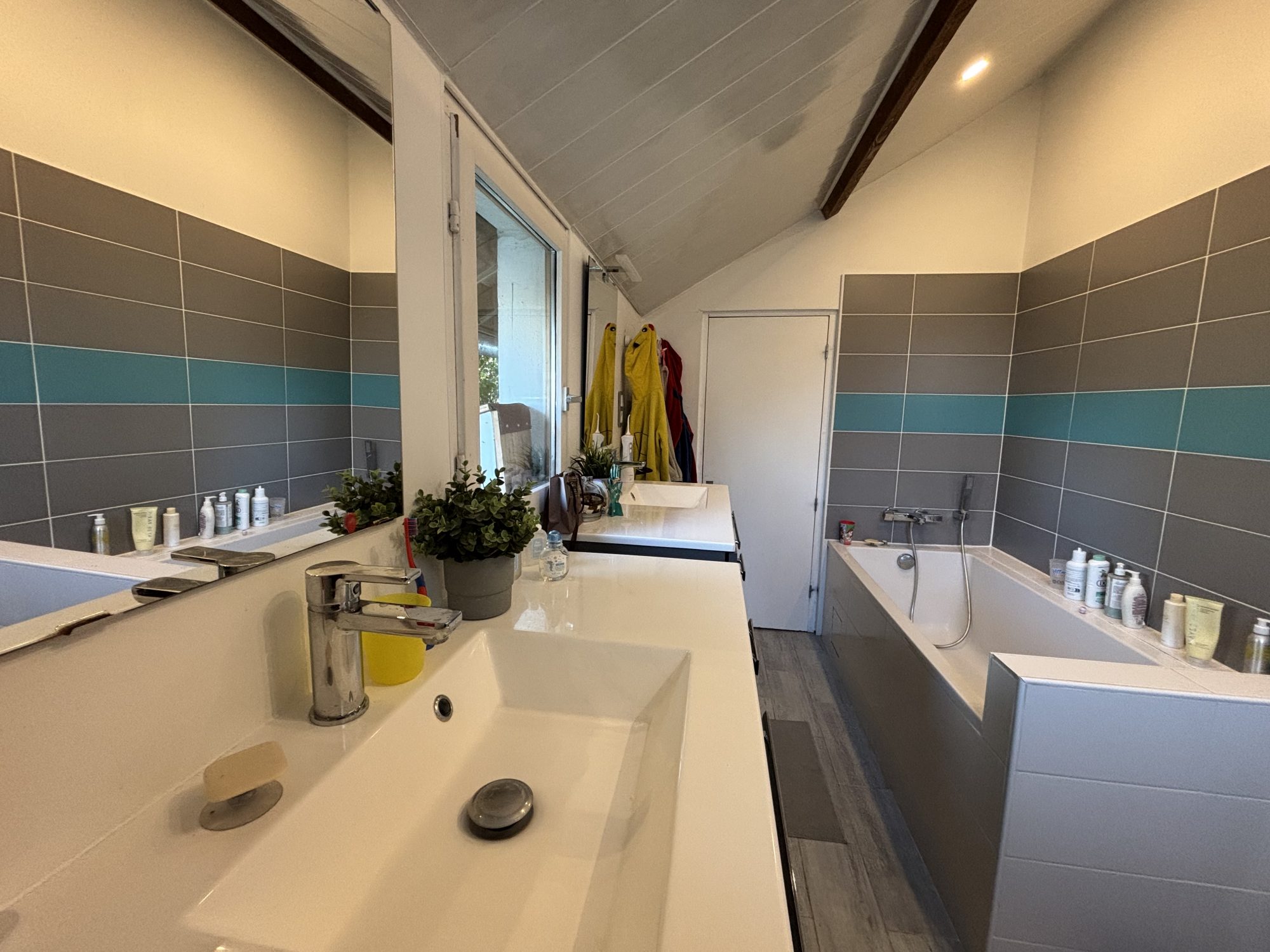 À l'étage, le palier dessert deux chambres situées de part et d'autre de la maison, un bureau et une salle d'eau avec WC.