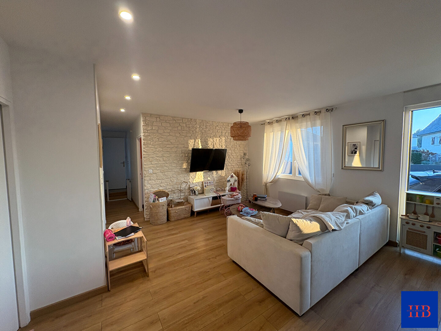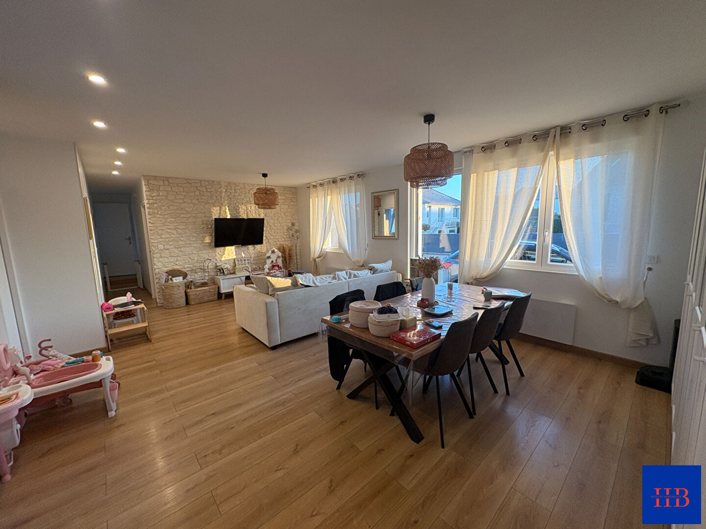 Pavillon de plain-pied entièrement rénové avec gout comprenant : buanderie, cuisine aménagée équipée, séjour-salon, sdb, wc et trois chambres dont une avec dressing.